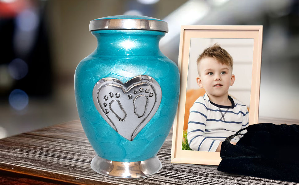 جرة زرقاء عالية الجودة ومتينة للأطفال: هذه الجرة الجميلة المتوسطة الحجم لرماد الأطفال الأولاد والبنات صلبة ومصنوعة من معدن عالي الجودة مع لمسة نهائية لامعة. تم تصميم جرة الرماد المعقدة يدويًا على يد حرفيين ذوي مهارات عالية باستخدام التقنيات التقليدية العريقة. كن مطمئنًا، فإن جرة حرق جثث الأطفال الرائعة هذه ستكون بمثابة رمز مؤثر لذكرى أحبائك.