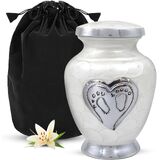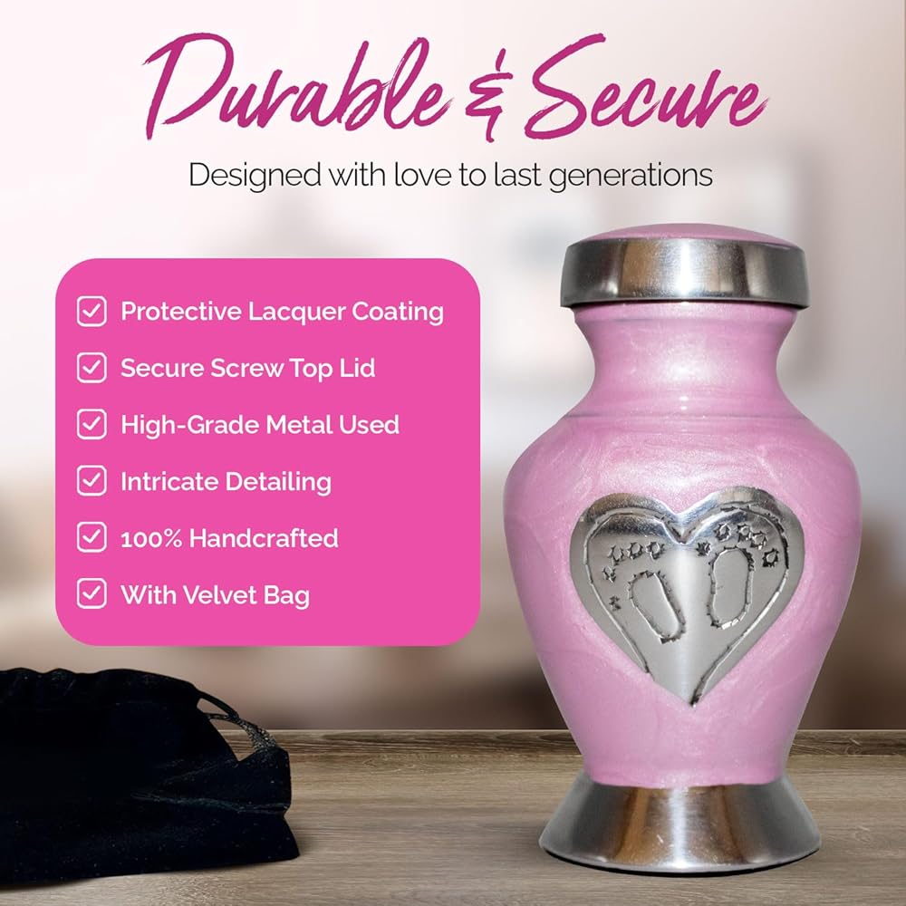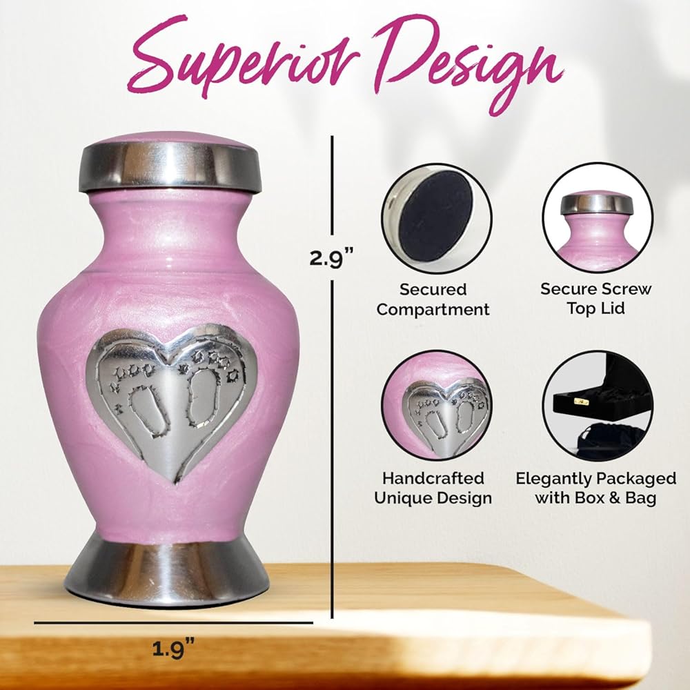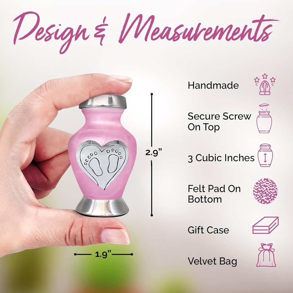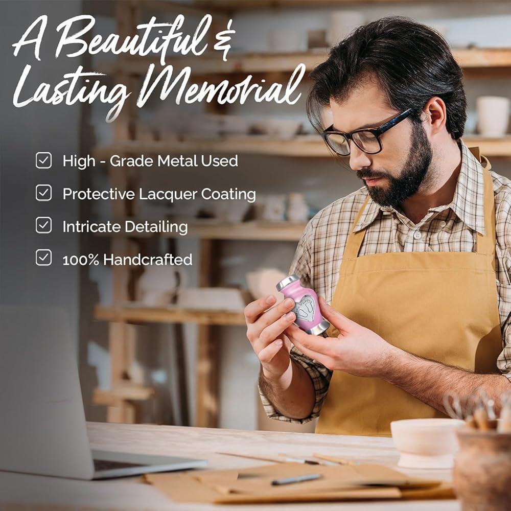 جرة أطفال جميلة للرماد: امنح أحبائك الحب الذي يستحقه. لقد صُنعت جرة الأطفال الخاصة بنا يدويًا بكل حب وعناية. تحتوي جرة الطفل الزرقاء على مسمار علوي ملولب، مما يضمن الحفاظ على بقايا طفلك آمنة. الجزء السفلي من جرة حرق رماد الأطفال مغطى بمادة عالية الجودة من أجل قبضة واستقرار أفضل. هذه الجرة الجميلة للأطفال الرضع ستكرم أحبائك إلى الأبد.