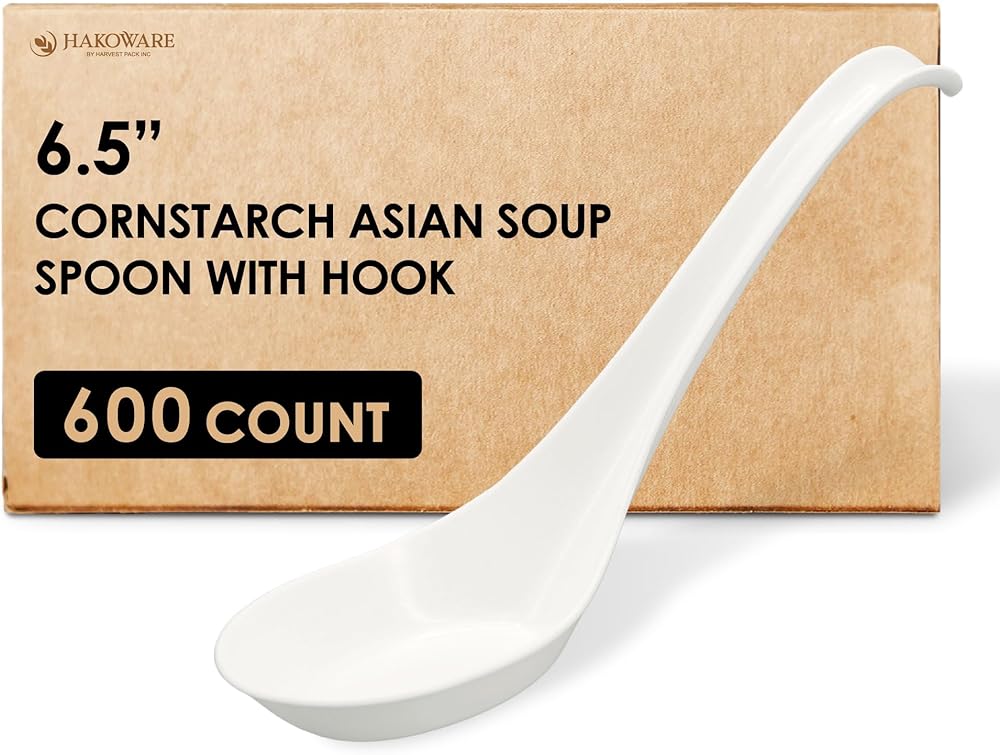 [600 قطعة] ملاعق شوربة آسيوية كبيرة للاستعمال مرة واحدة من هاكووير مع خطاف، مصنوعة من نشا الذرة المتبلور، لنودلز رامين فو، أدوات للاستعمال مرة واحدة، حجم كبير ومتين