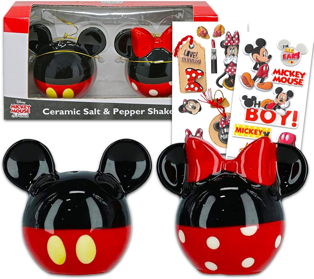 Mickey and Minnie Salt and Pepper Shakers Set - Disney Kitchen Accessories Bundle with Mickey and Minnie Salt and Pepper Shakers Collector Set Plus Stickers | Mickey and Minnie Collectibles. This Disney kitchen supplies set comes with 1 salt shaker and 1 pepper shaker, shaped like Mickey and Minnie's heads. These Mickey Mouse and Minnie Mouse salt and pepper shakers are great to include in a Disney kitchen gift set or to keep at home to add to your own Mickey and Minnie collection. Hand wash these Mickey Mouse and Minnie Mouse salt and pepper shakers to preserve their colorful artwork. Officially licensed Disney Mickey and Minnie salt and pepper shakers set also comes with Mickey Mouse stickers and Minnie Mouse stickers.