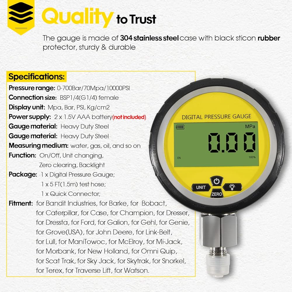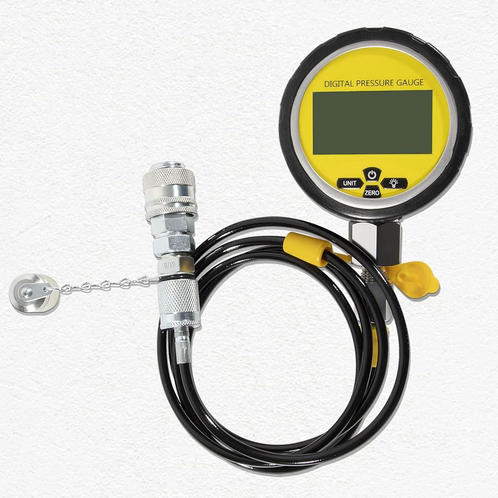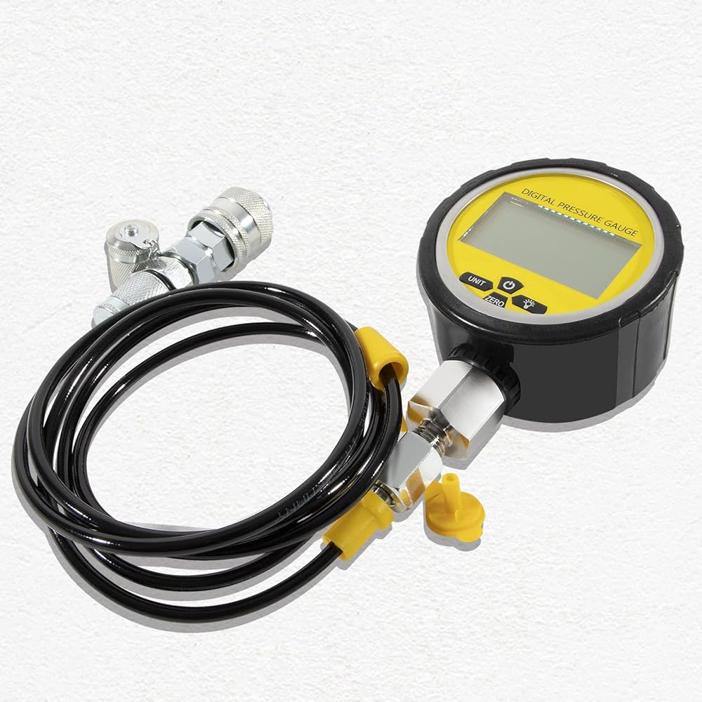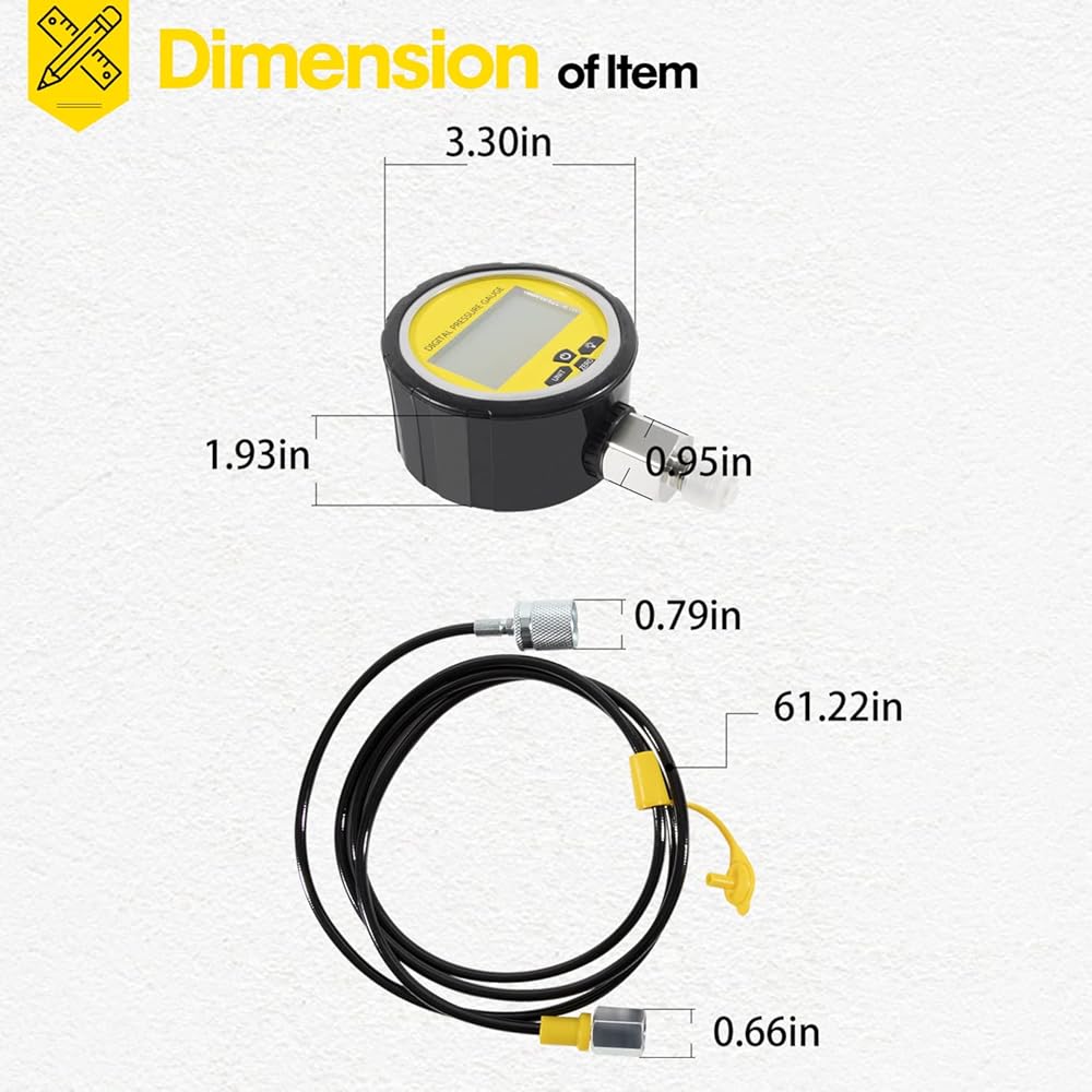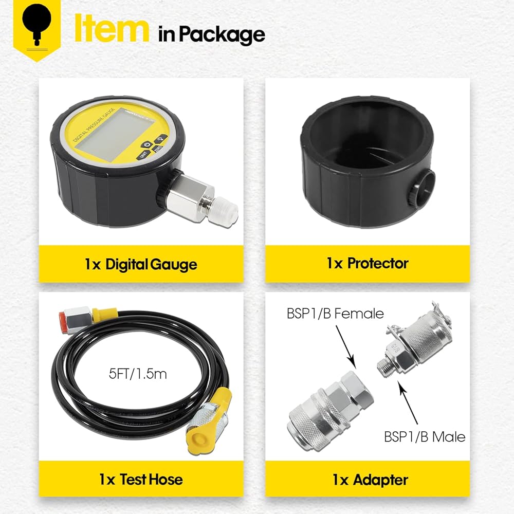 • WHAT YOU GET - 1 Intelligent Digital Pressure Gauges: 0-700BAR/10000PSI/70Mpa; 1 protector; 1 5-feet test hose; 2 types Quick Release Coupling, BSP1/8 Female and BSP1/8 Male