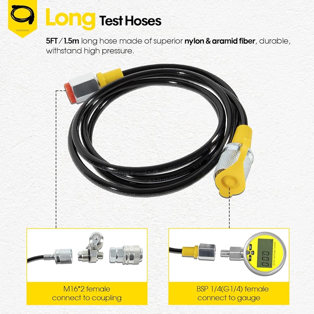 • LONG TEST HOSES - made of superior nylon & aramid fiber, durable, withstand high pressure. 5FT / 1.5m Length Hose has an M16*2 end and a BSP 1/4" female at the other end. High strength & reliability couplings for easily reading accurate results