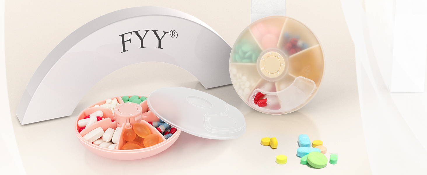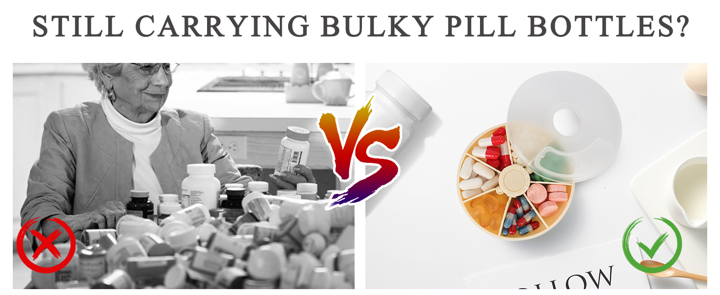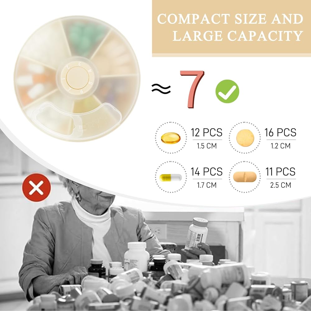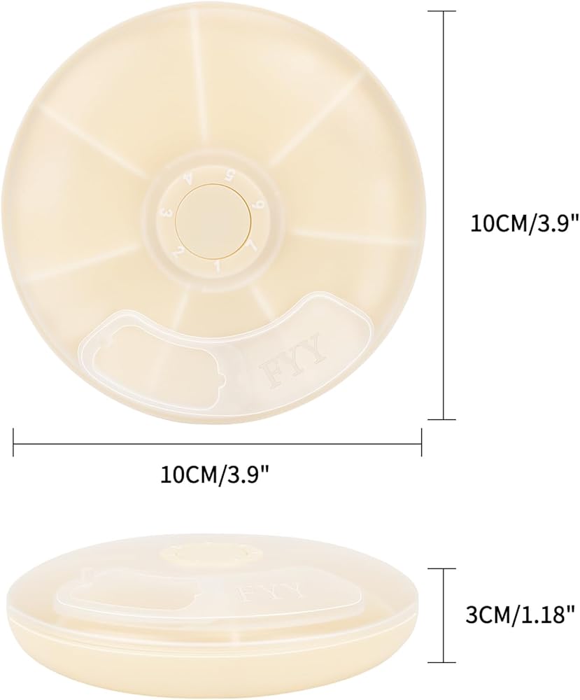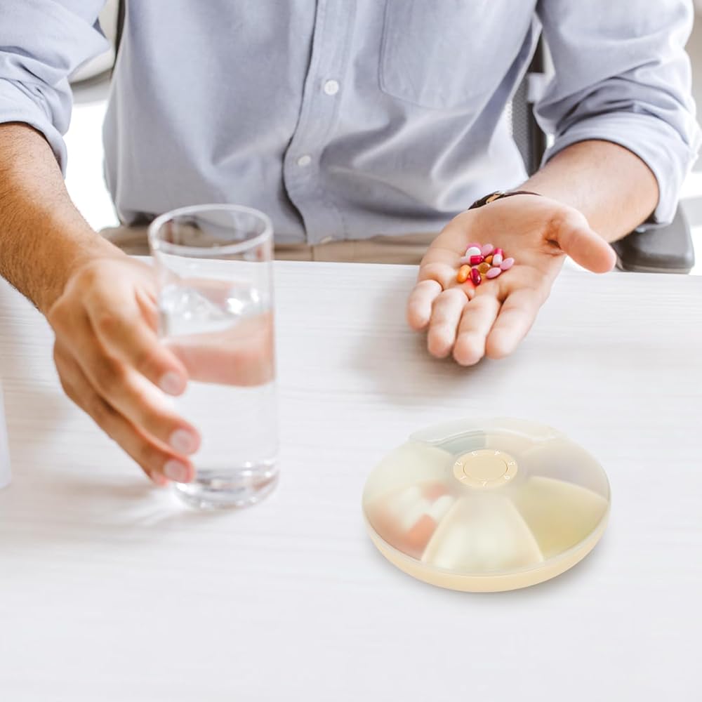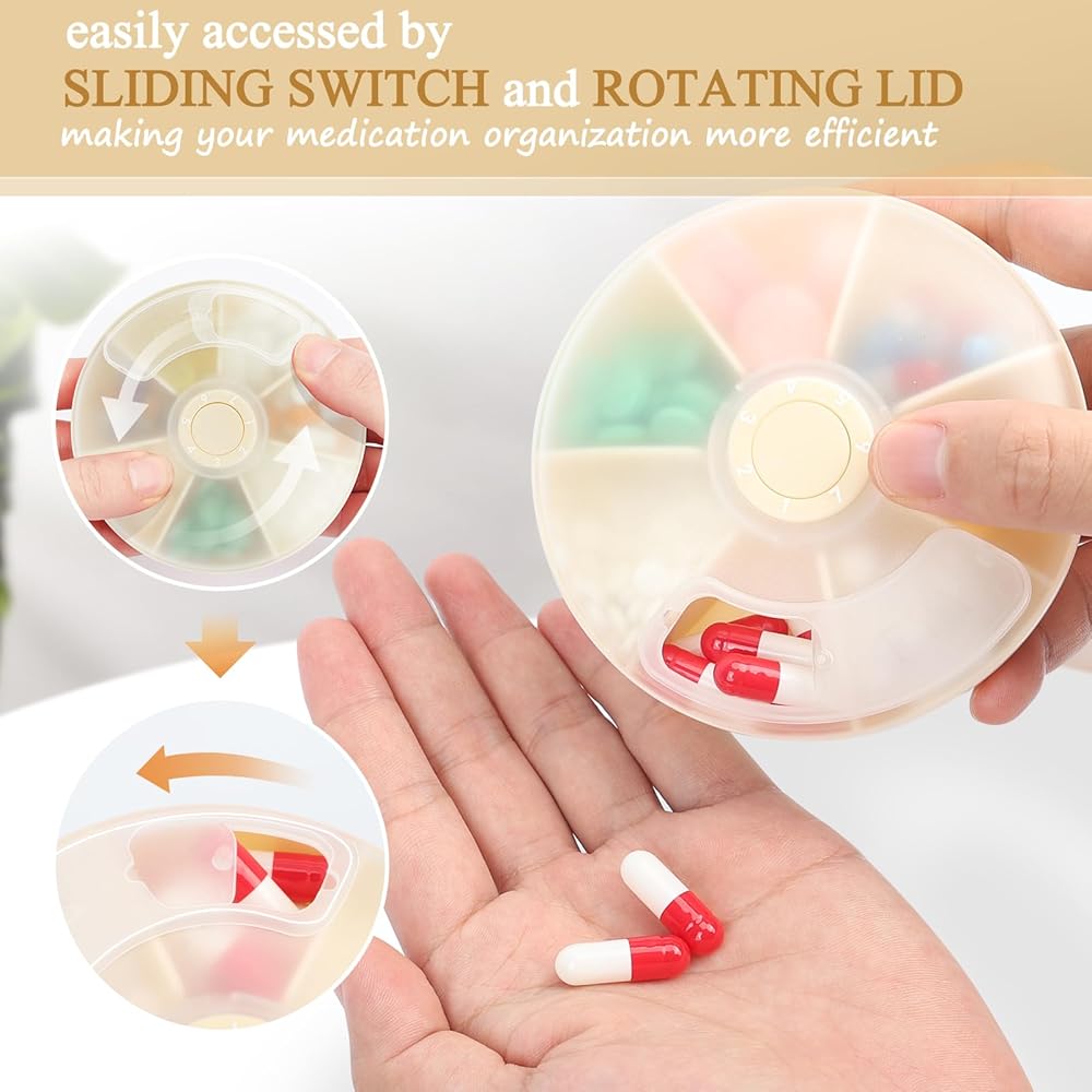 منظم حبوب الدواء الصغير: تم تصميم طريقتين للفتح: اضغط على الزر الأوسط، وافتح جميع المقصورات في وقت واحد. أو دوران الغطاء 360 درجة إلى الحجرة المقابلة لوضع الحبوب أو تناولها بسرعة