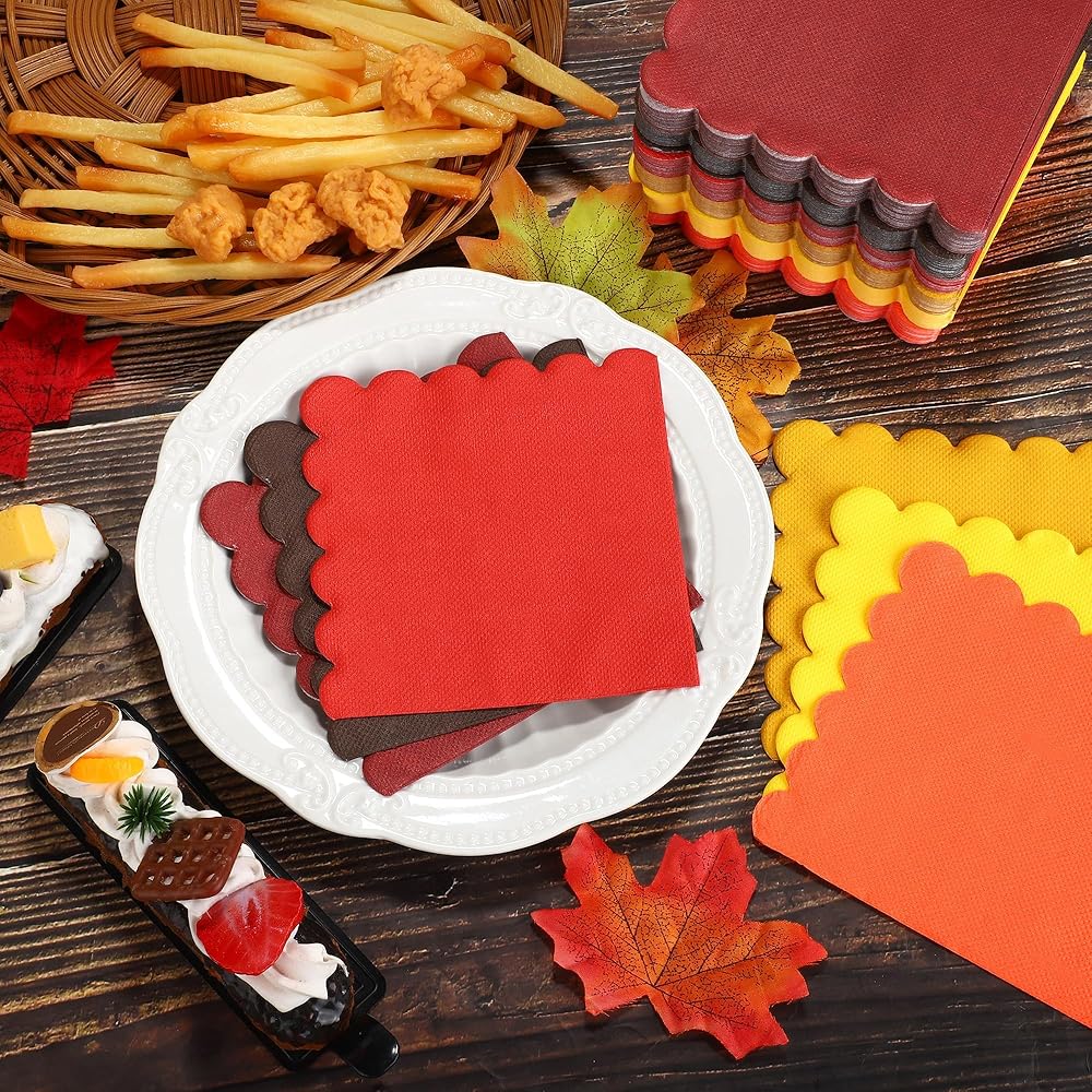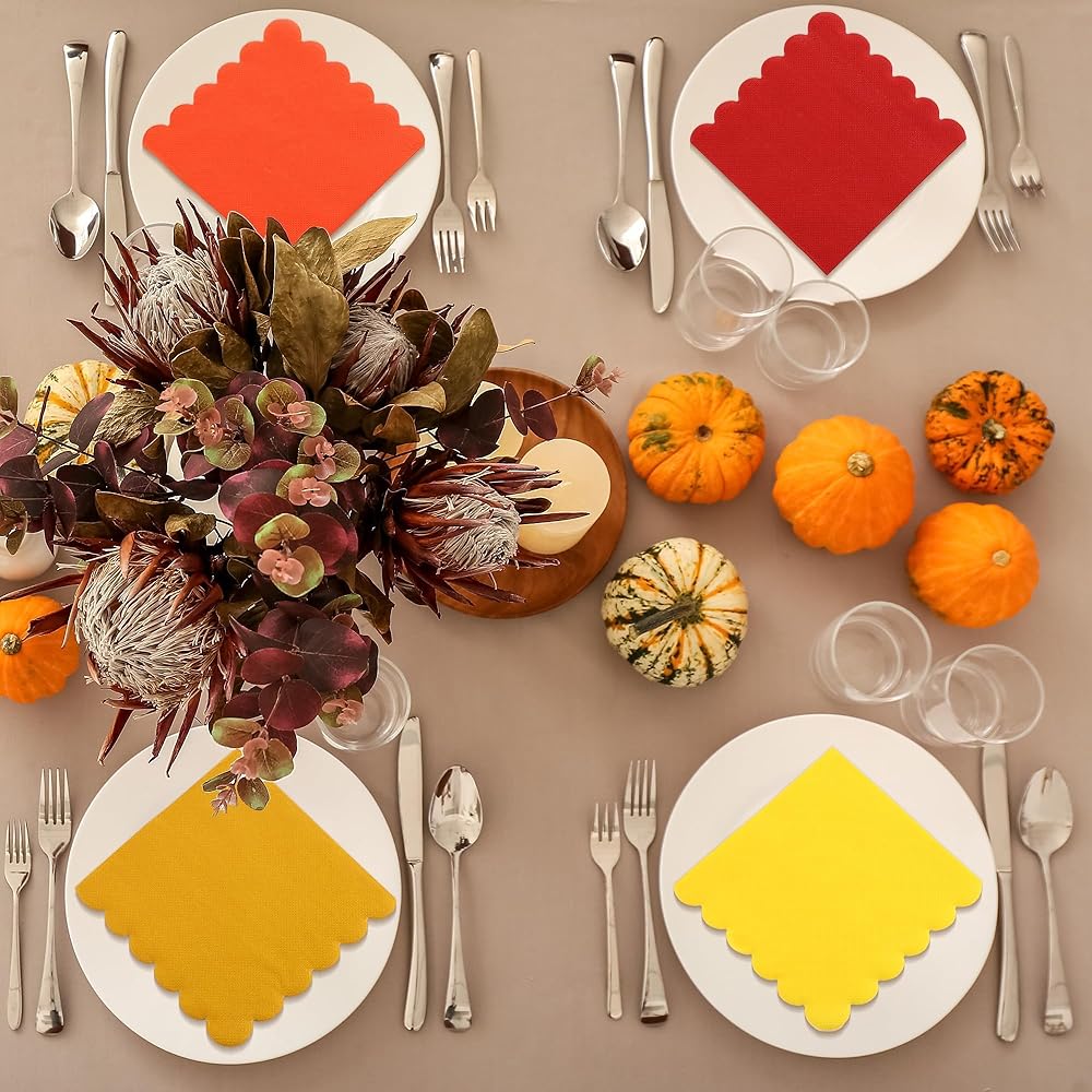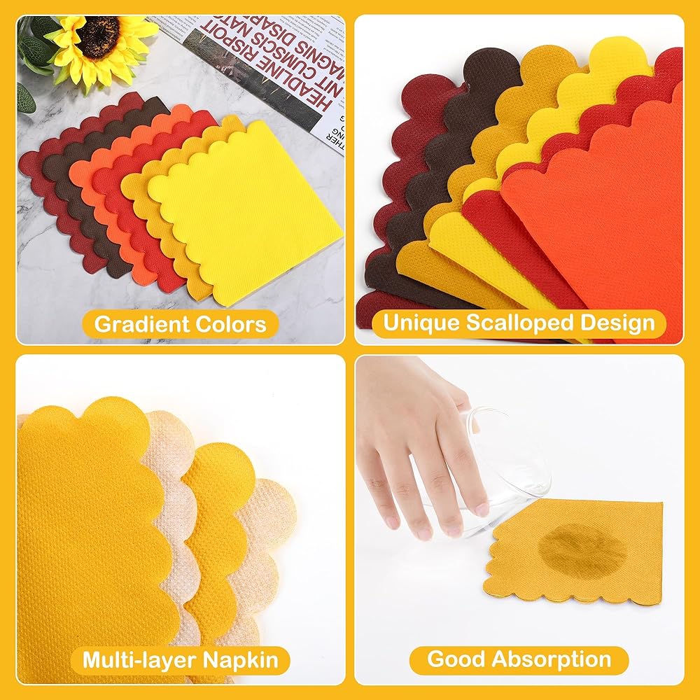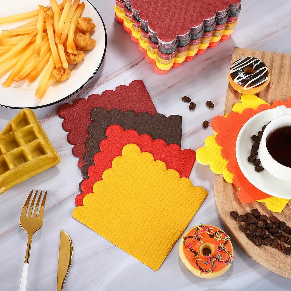 Packaging & Quantity: you receive 150 splendid scalloped napkins, beautifully crafted in a stunning autumn color gradient with a total of 6 hues, providing 25 napkins for each shade; the generous quantity is thoughtfully selected to cater to all your party needs!