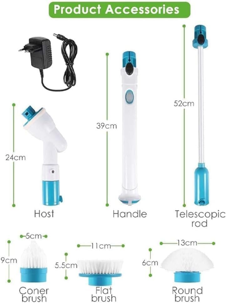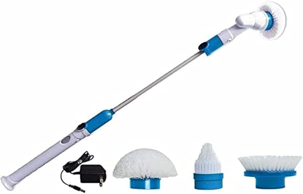 Includes the Hurricane Spin Scrubber brush with 3 brush heads, charger