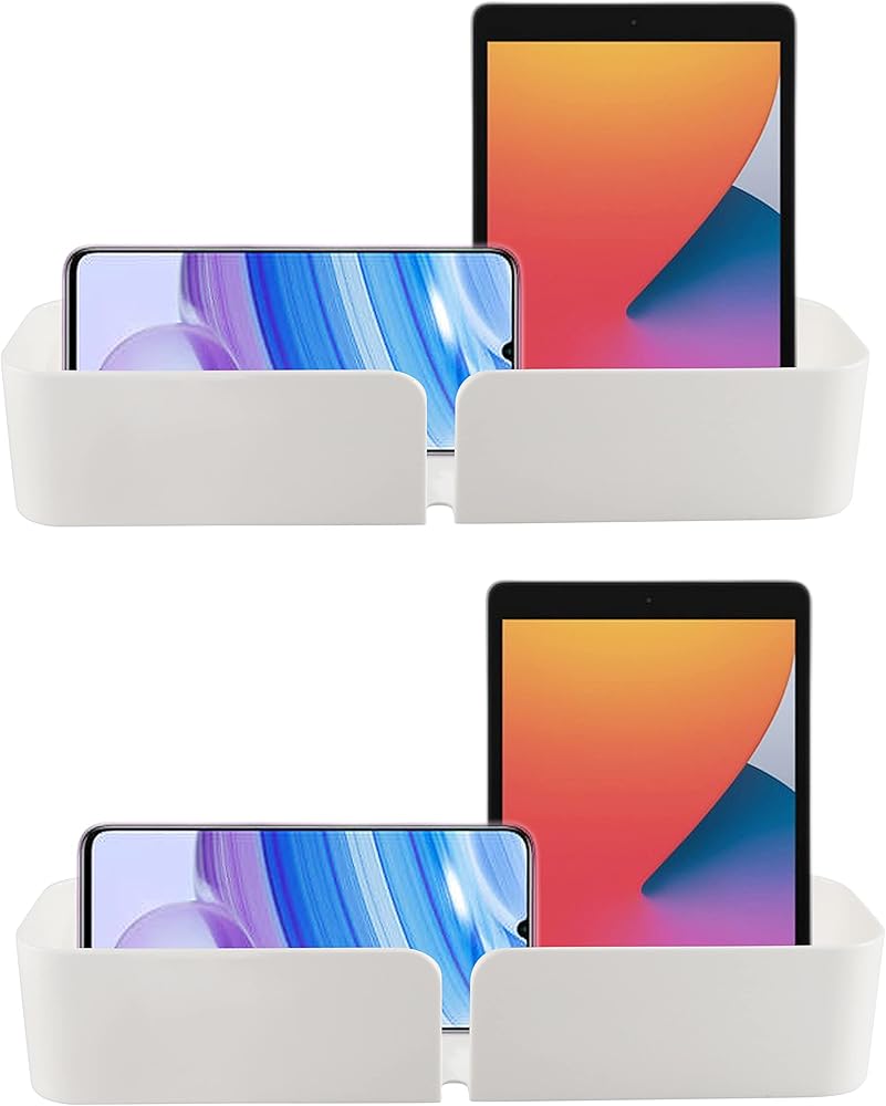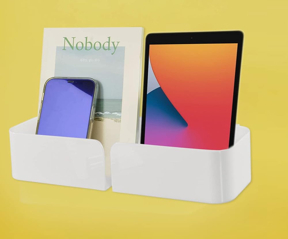Are you ever watching TV in bed when you suddenly can't find your remote amid the blankets and pillows? Or is your nightstand so full with your things and clutter that you find yourself searching for space to plug your phone in before bed? With our, set of 2, floating remote and phone holder, you can organize all our things for easy access and aesthetic design! They are perfect for places with minimal space, such as a dorm room, shared children's room, closet, kitchen, office, or even RV. Make a cute space for your belongings without taking up too much space, and still have a place to put your phone or tablet while they charge overnight. These mountable caddies are easy to install and only takes minutes to set up. These no-nail shelves can be easily installed anywhere because of the adhesive install kit, so you don't have to worry about tearing paint or drilling into surfaces like tile or plastic. The shelves also includes screws for a hardware-mounting option if you have a lot of bedside accessories to organize. Use them as a dorm bookshelf for late-night studying or as a kid's book caddy to make reading fun and accessible! Put them near your front door as a mail organizer and never lose any important pieces of paper. These wall mounted organizers can be placed wherever you need them. Your life will get much more organized with these floating organizers. Your devices will thank you as they are charging untangled from their power cords. Each one measures 10" L x 3" W x 2" H, giving you plenty of space for whatever items you want to organize on the wall. They make a perfect gift for a student in need of dorm storage or kids who need more space in a shared bedroom. Wherever you use, the HOME-X Set of 2 Floating Wall Organizers can help you organize your belongings so you can clear clutter and keep things in place.