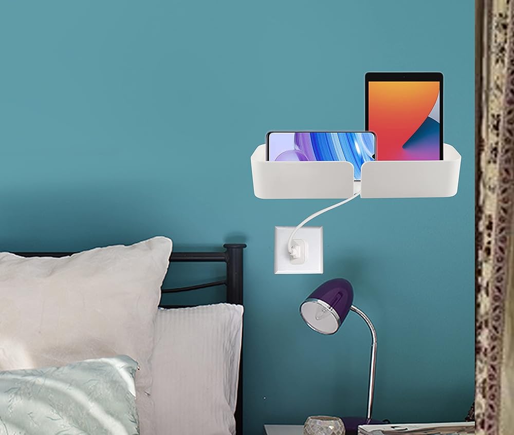 مجموعة Home-X مكونة من منظمي حائط عائمين مع فتحة لشاحن الهاتف، وأرفف لاصقة سهلة التركيب، ومنظمات حائط لجانب السرير أو المطبخ أو المكتب، بطول 25.4 سم × عرض 7.62 سم × ارتفاع 5.08 سم، أبيض