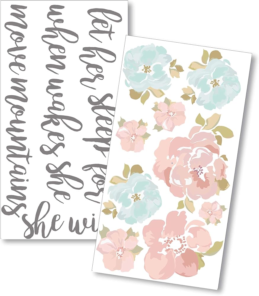 CREATE LARGE MURAL: The decals come in a pack and can be assembled to create a beautiful sentiment accented with gorgeous flowers in aquas and pinks. Position as shown in the photograph, or create your own design. When assembled as shown, the mural is 33 in. wide and 79 in. high.