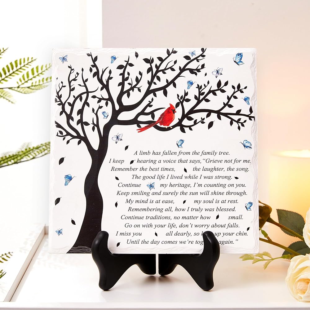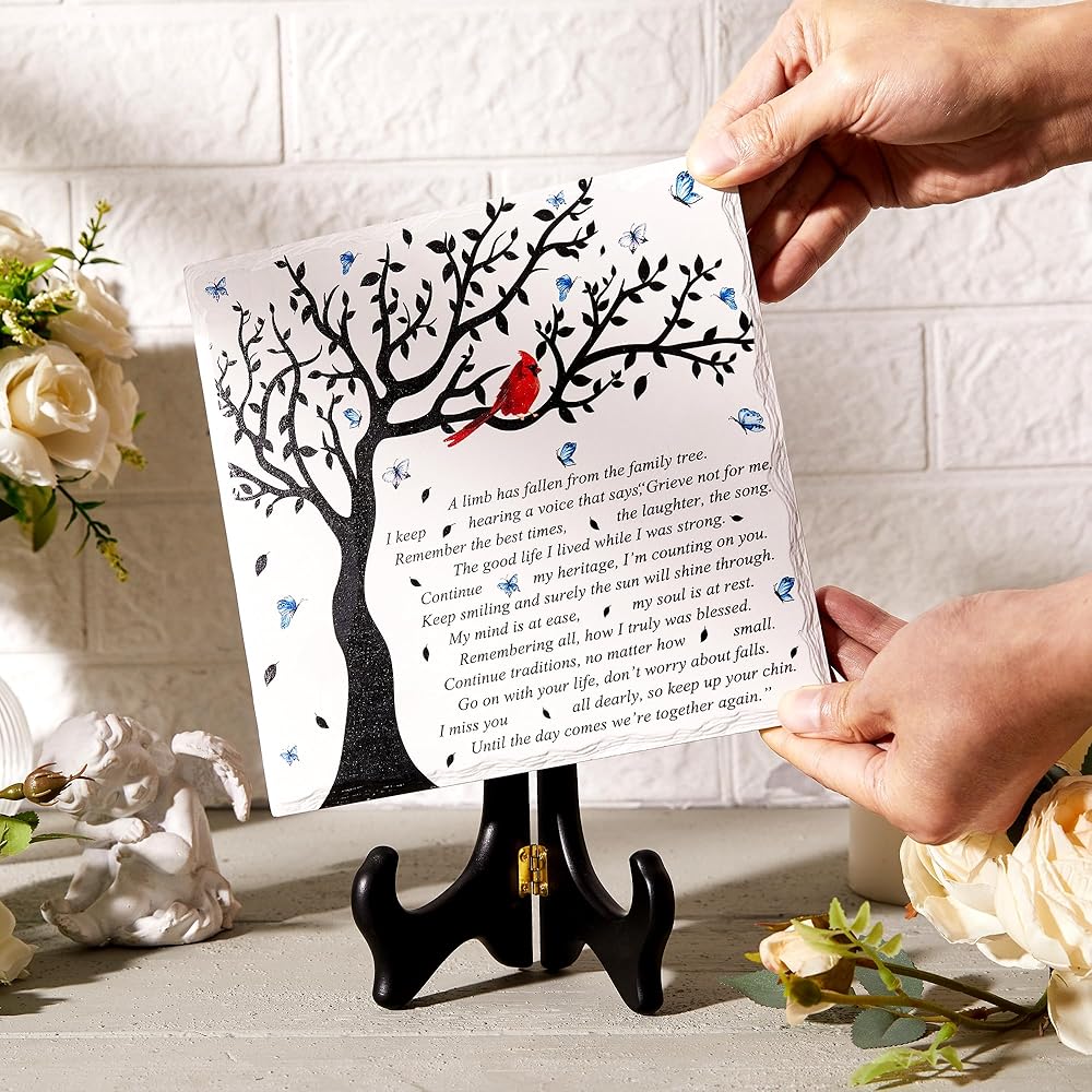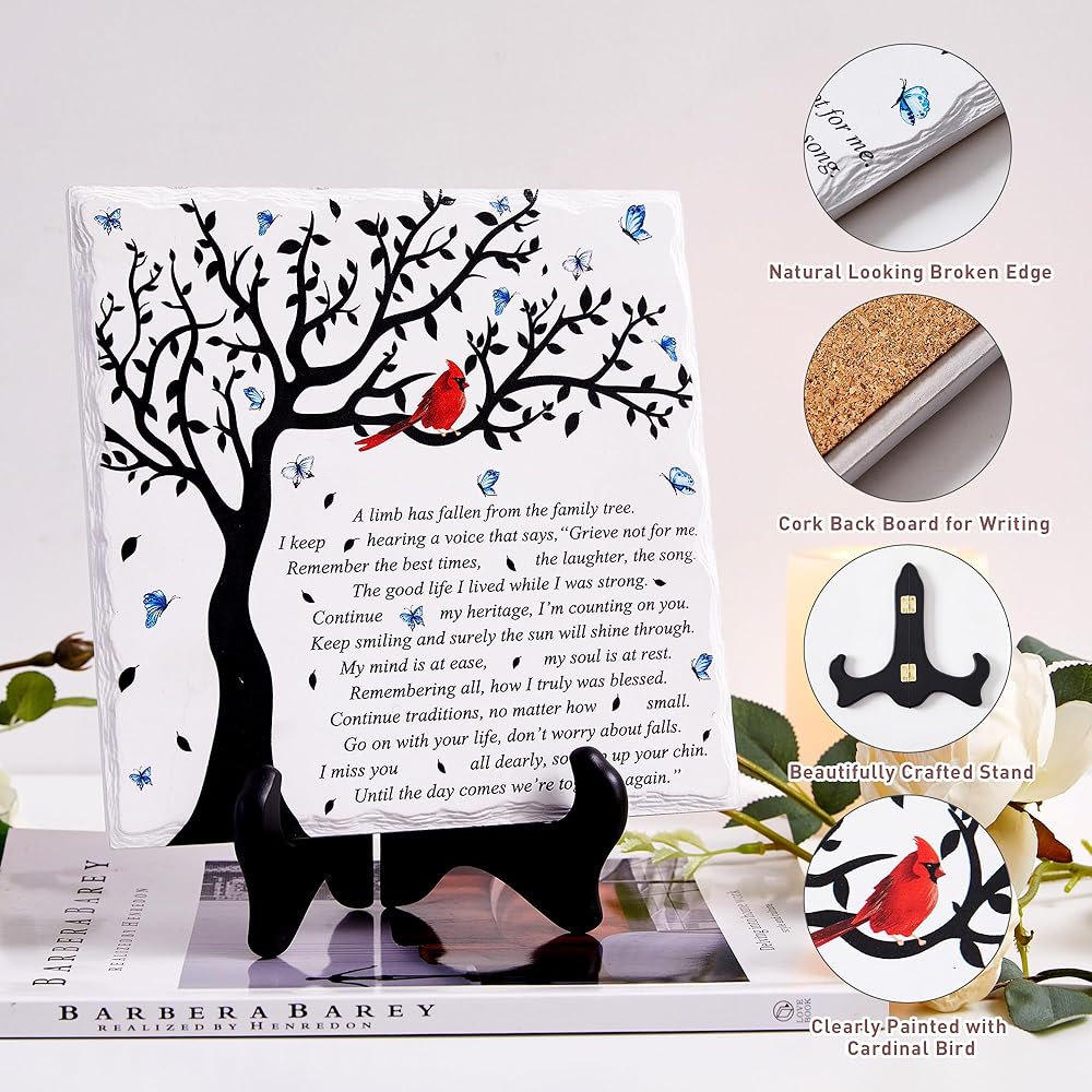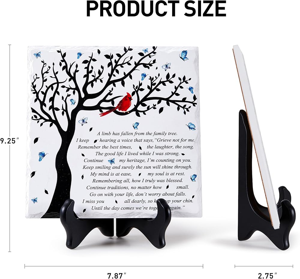 • جودة عالية ومصنوعة بشكل جميل. لوحة تعاطف WOODEXPE مصنوعة من مادة الخشب والسيراميك. مصممة بحافة مكسورة ذات مظهر طبيعي ومطبوعة بكلمات مؤثرة، واضحة ولا تبهت أبدًا. الرسالة المكتوبة: "لقد سقط أحد الأطراف من شجرة العائلة".