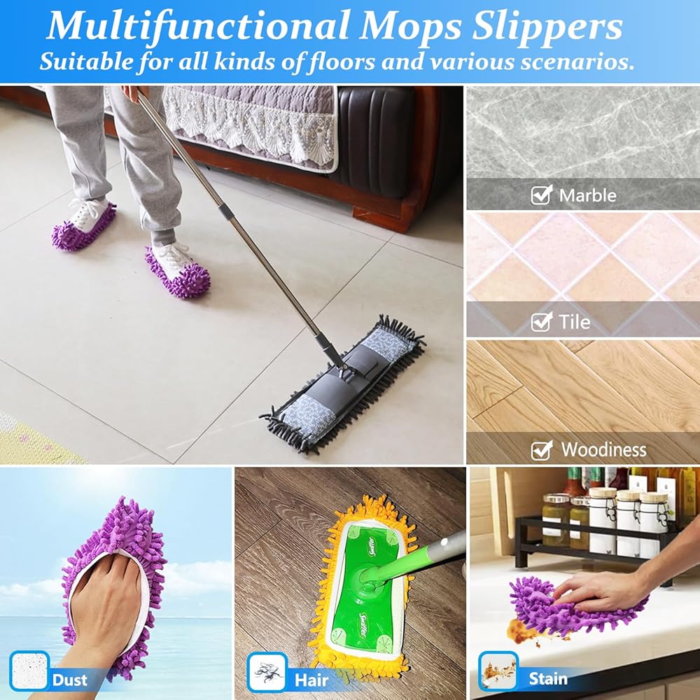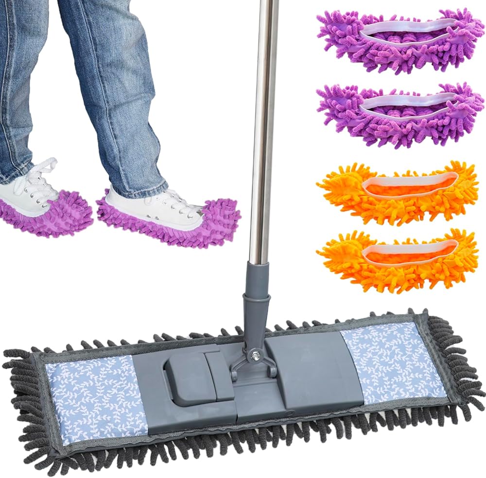 Our versatile cleaning solution - the 80-inch Adjustable Length Microfiber Flat Mop. This innovative cleaning tool comes with 2 pairs of Shoe Cover Dusters, a sturdy Stainless Steel Handle, and a Washable Chenille Mop Head, making it the perfect choice for all your household cleaning needs.