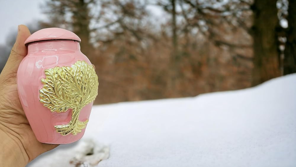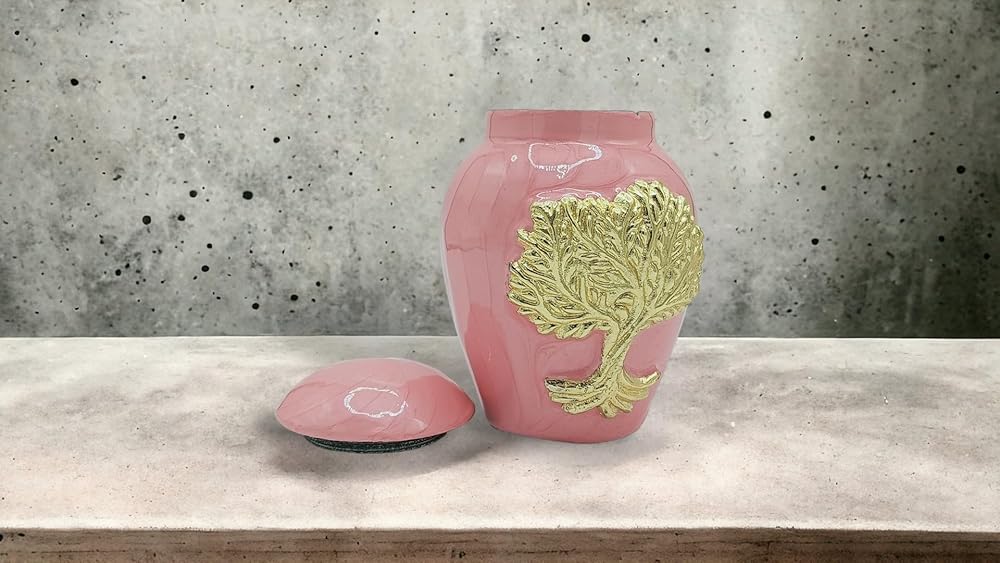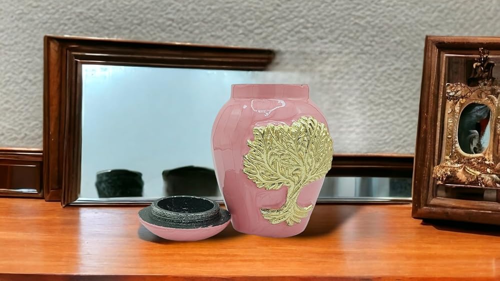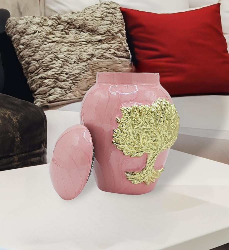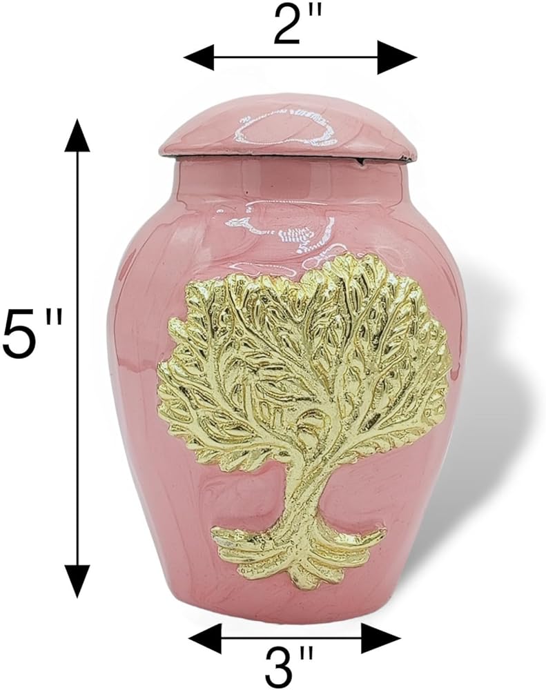 جرار حرق جثث وردي للرماد للبالغين من الذكور والإناث - جرار زخرفية جميلة وفريدة من نوعها ثلاثية الأبعاد مع حقيبة مخملية - جرة حرق جثث صغيرة من الألومنيوم مقاس 5 بوصات لجنازة الحيوانات الأليفة (شجرة الحياة الوردية)