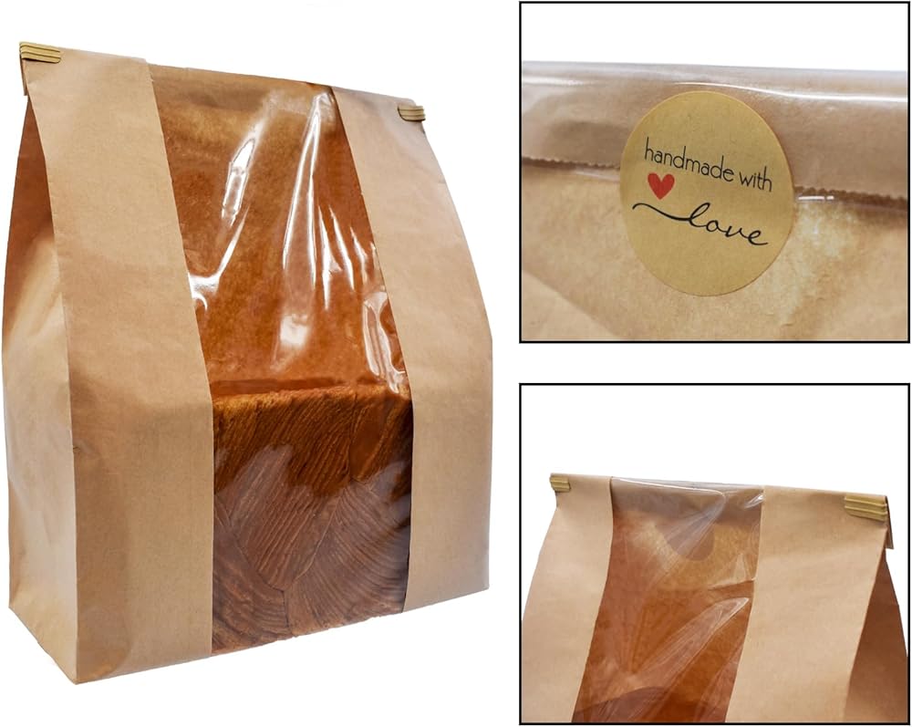ورق كرافت عالي الجودة: أكياس الخبز المصنوعة من العجين المخمر للخبز المنزلي (100 قطعة) مصنوعة من ورق كرافت عالي الجودة، الحقائب ذات أداء قياسي، قوية ومتينة، مقاومة للتمزق (مع 500 قطعة - محلية الصنع مع الحب - ملصق ختم الملصق - 1.5 ")