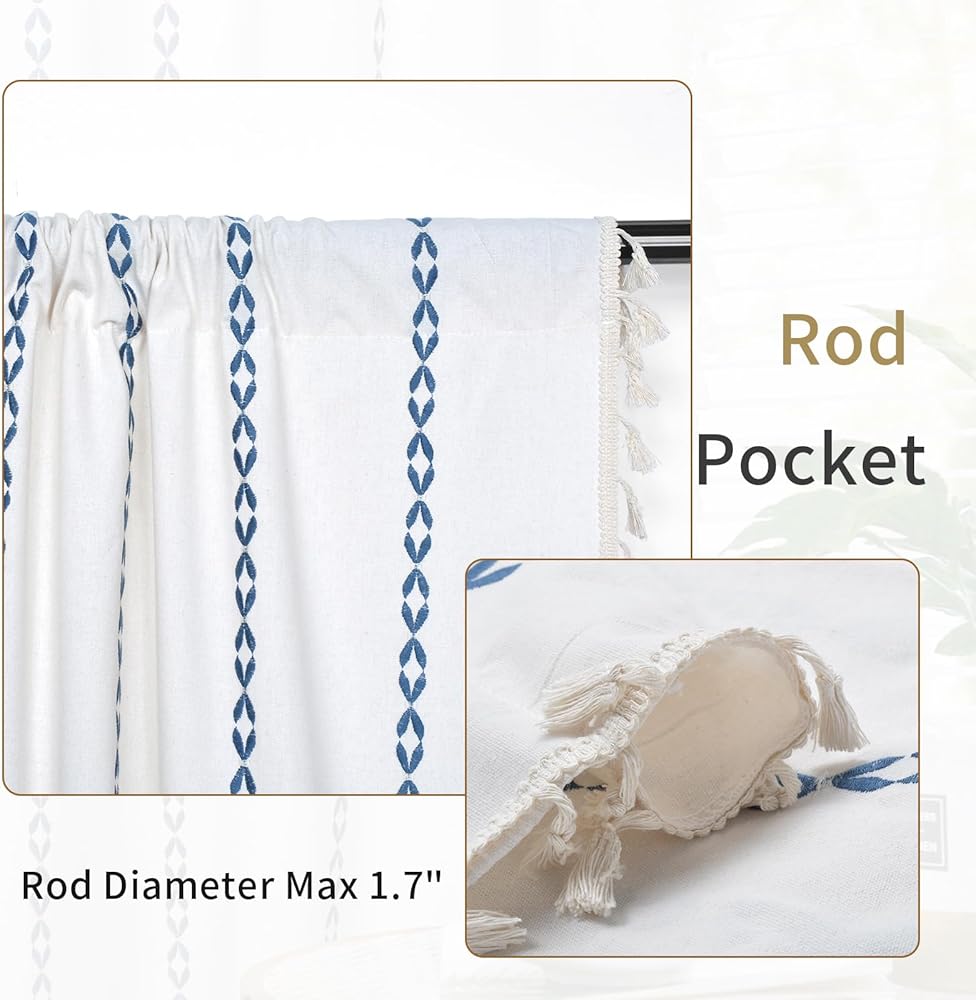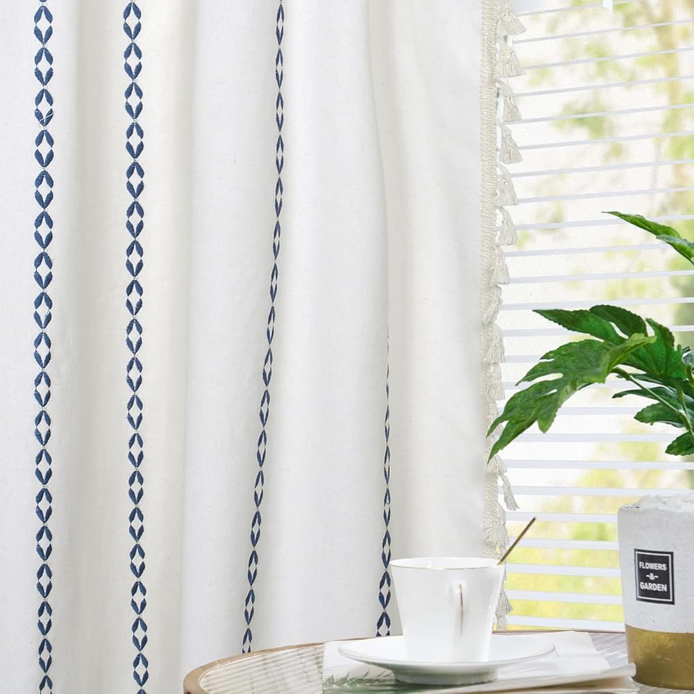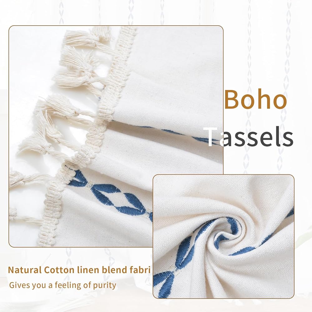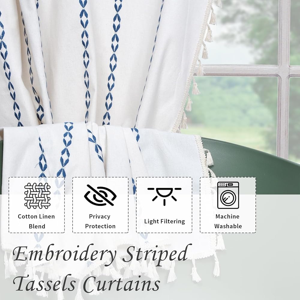 ستائر Schweek Boho بطول 63 بوصة لغرفة النوم وغرفة المعيشة وستائر مخططة مطرزة في المزرعة وطبقتين من الكتان وستائر شرابات شبه معتمة، باللون الأزرق على الكريم