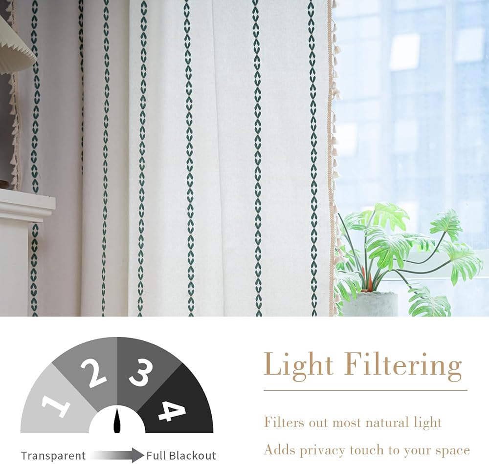 • لوحتان من الستائر الشرابة - تتضمن حزمة ستائر النافذة المصنوعة من الكتان الشرابة لوحتين ستارة بوهو، قياس كل منها 52 بوصة عرض و84 بوصة طول (104 بوصة عرض للزوج.. تصميم جيب قضيب، سهل التركيب والانزلاق. يوفر مظهرًا طبيعيًا وجيد التهوية وإحساس خاص بغرفة المعيشة وغرفة النوم والحضانة والمكتب والدراسة