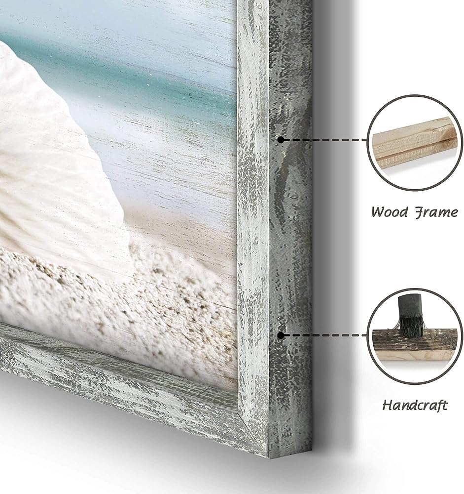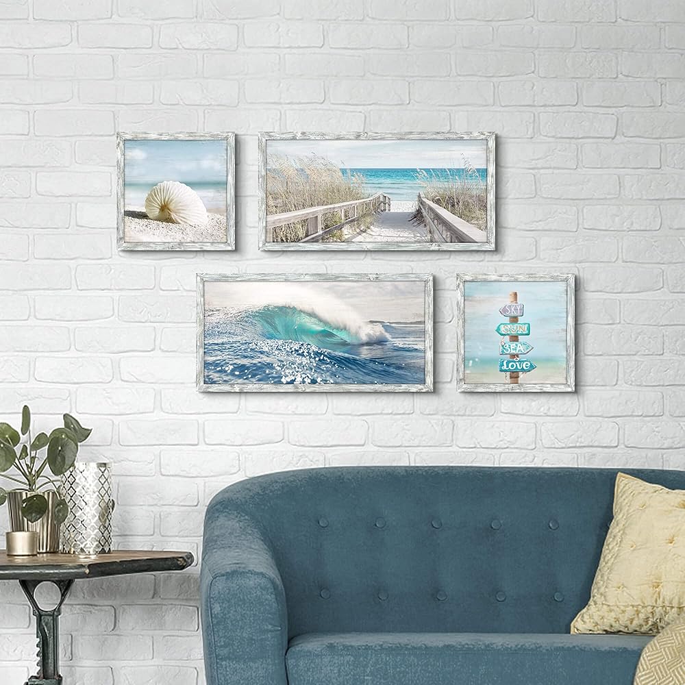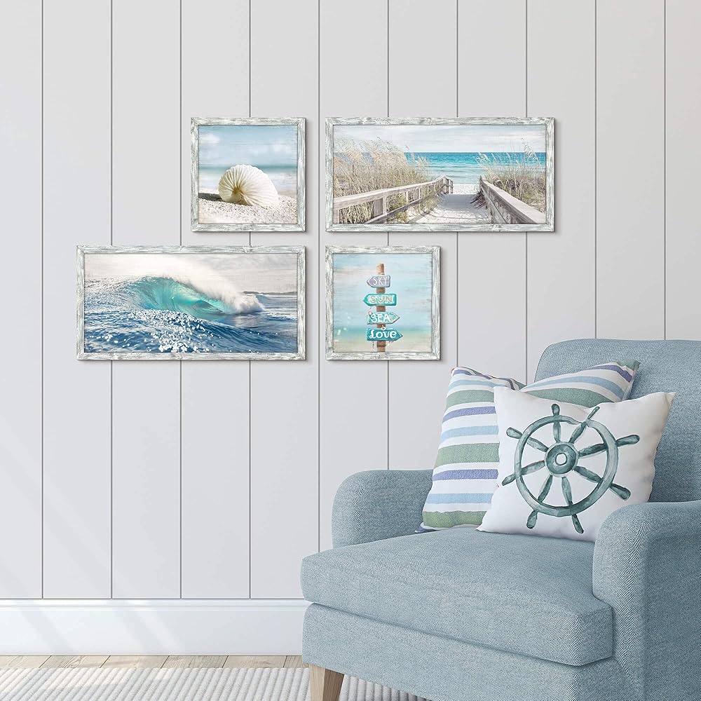 لوحة فنية جدارية للمحيط بإطار خشبي: مجموعة من المطبوعات الساحلية لأعمال فنية للشاطئ مكونة من 4 قطع ديكور جداري لغرفة المعيشة بشكل عام 36 بوصة عرض × 24 بوصة ارتفاع