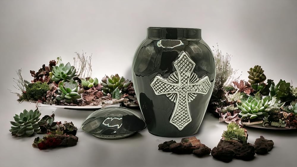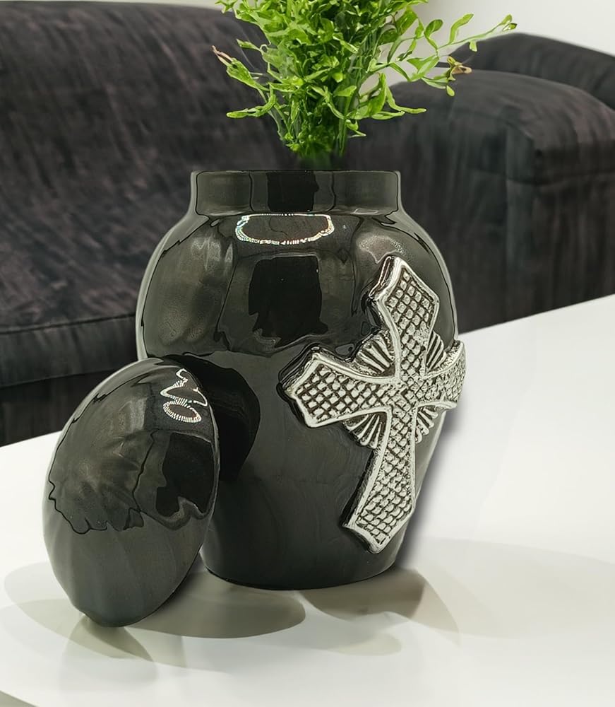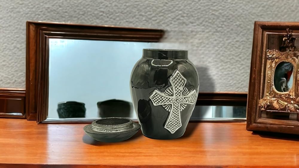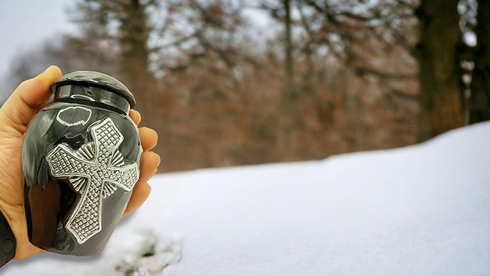 {الأبعاد}:- حجم الجرة: 5 بوصة. طويل مصمم لمشاركة الرماد بين أفراد العائلة أو الأصدقاء. هذه الجرة الصغيرة الحجم للرماد البشري يمكنها حمل كمية صغيرة من الرماد والزهور والشعر والأرض من موقع القبر...