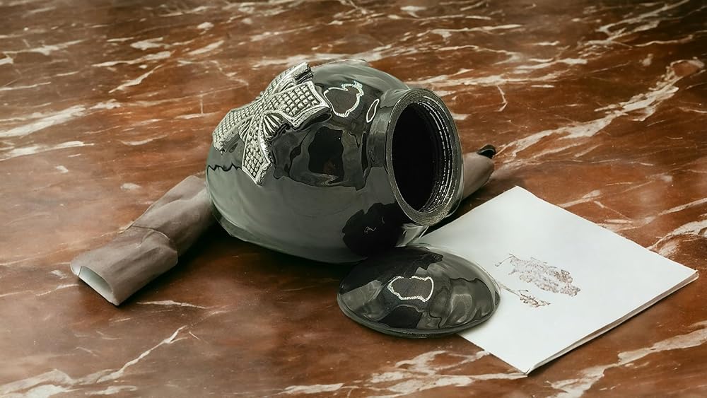 {التصميم}:- حقيبة الرماد السوداء الجميلة هذه مع حقيبة مخملية متوفرة بثلاثة أشكال فريدة من نوعها ثلاثية الأبعاد من الألومنيوم، وشجرة الحياة وأجنحة الملاك كما هو موضح في الصور. ستبدو هذه الجرة جميلة جدًا ويمكن وضعها بسهولة على الرف أو الطاولة أو الغطاء. إنها تحية جميلة لتكريم من تحب والذي سيظل دائمًا جميلًا في قلوبنا.