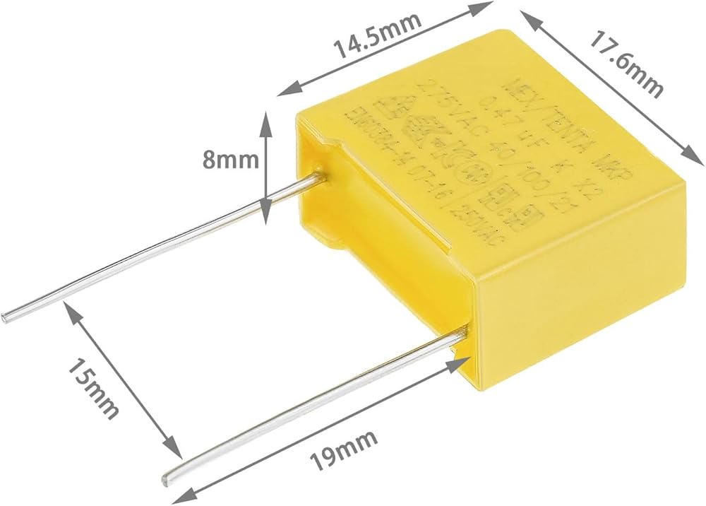 • المكثفات: 0.47 فائق التوهج؛ المنشفة: K (± 10%)، جهد التيار المتردد: 275 فولت، غرزتان قطريتان.