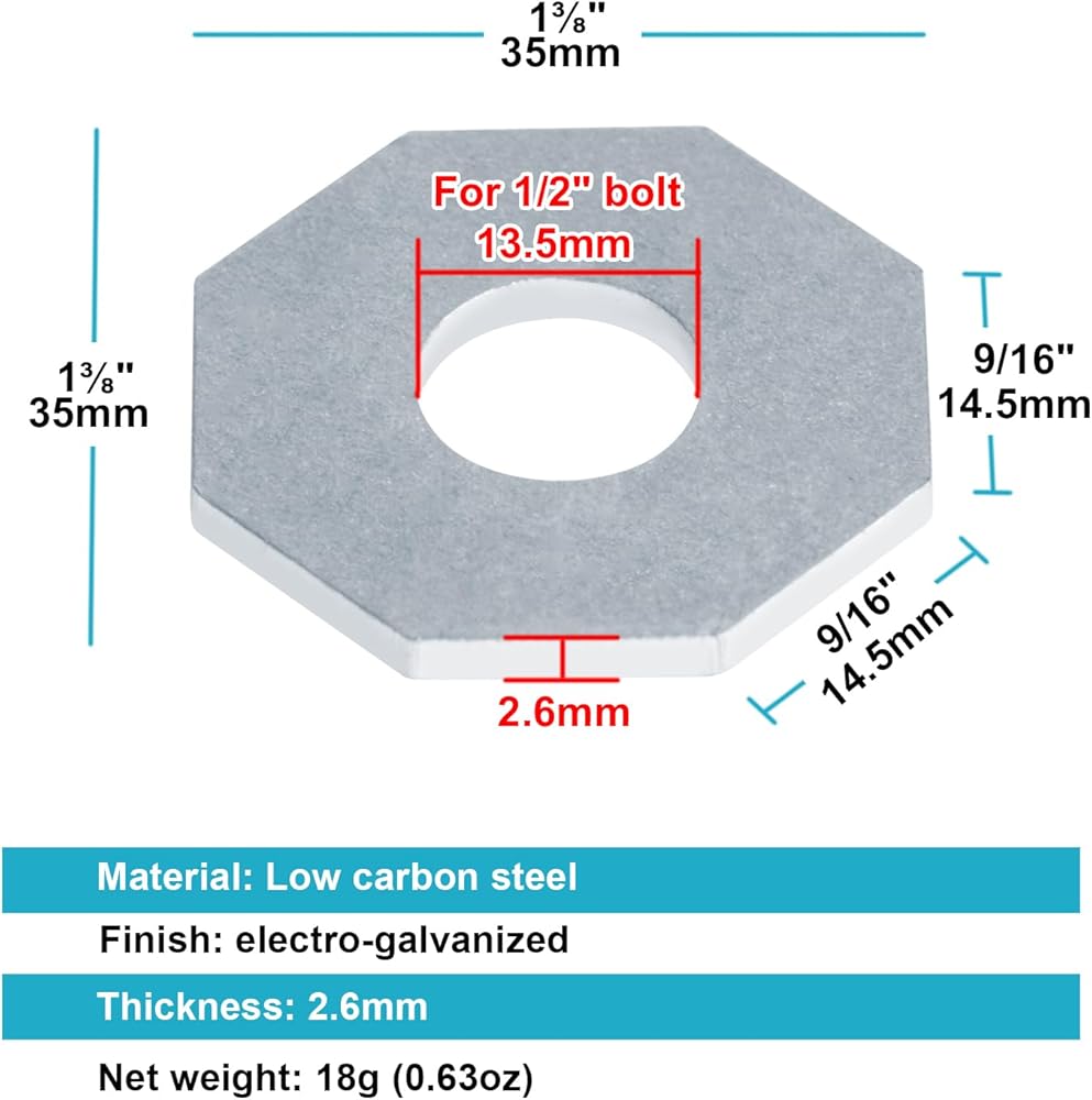 30 حزمة من غسالة القنوات ذات الدعامة المركزية، لوحة غسيل مثمنة مسطحة 1-3/8 بوصة، لقناة تبختر 1-5/8 بوصة تناسب مسمار 1/2 بوصة، فولاذ مجلفن كهربائيًا