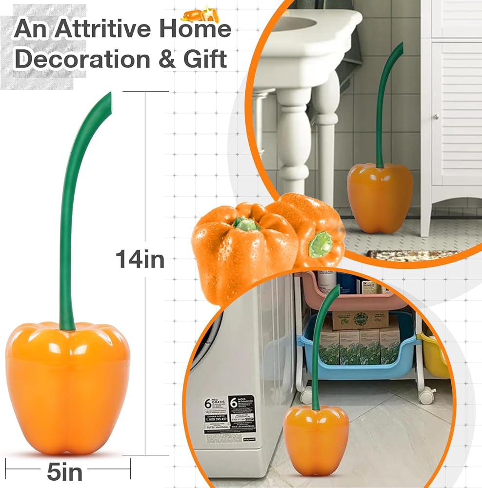 🫑【شعيرات حمام عالية الجودة 】رأس فرشاة المرحاض على شكل فلفل الجرس للحمام مع حامل مصنوعة من شعيرات قوية وكثيفة، مادة ABS/PP، والتي يمكنها إزالة البقع بقوة وتنظيف الحمام بسهولة. تم تصميم المقبض الطويل لجذع الفلفل الحلو بدقة لتوفير قبضة قوية ومريحة.