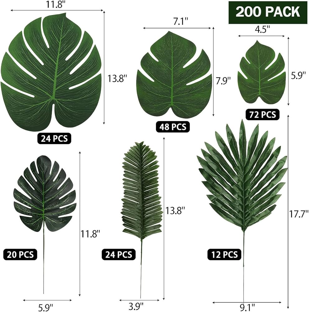 【200 Value Set】You will receive 200pcs palm leaves of 6 types, multiple types and quantities, suitable for creating a rainforest atmosphere.