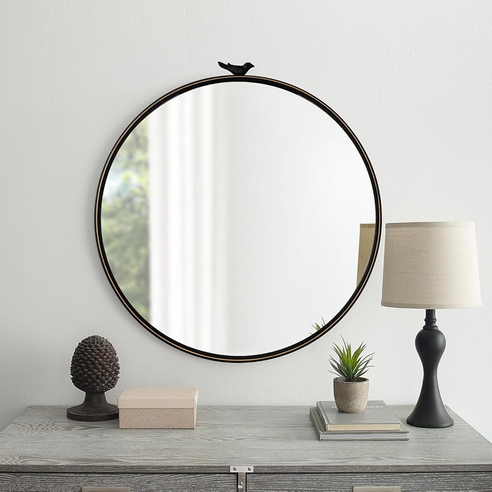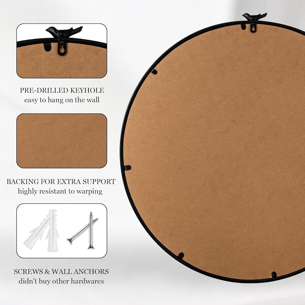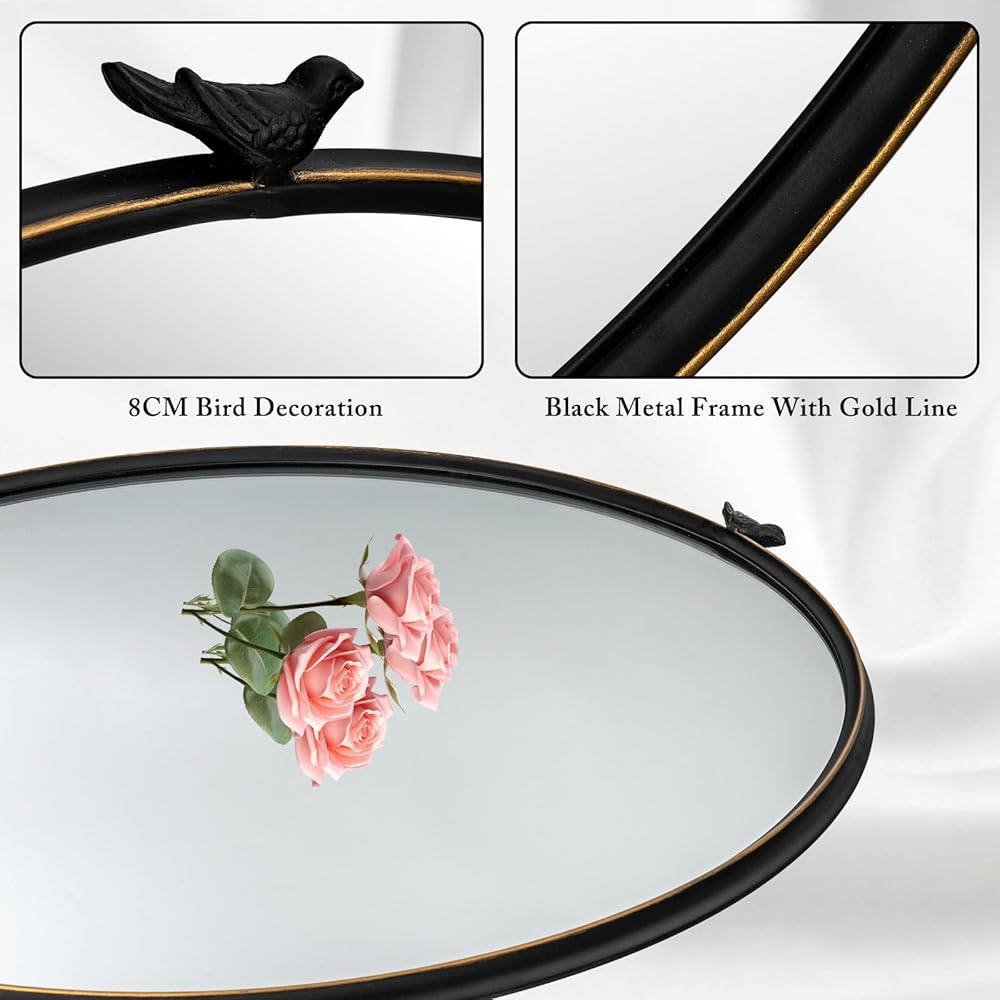 【تصميم رائع لا يتأثر بمرور الزمن】 طائر أنيق في الجزء العلوي بلمسة نهائية سوداء عتيقة، والخطوط الذهبية على الحلقة الخارجية تعزز إحساس الخطوط وتصميم المرآة. المرآة المستديرة هي قطعة خالدة مصممة لرفع مستوى ديكور الحائط الخاص بك.