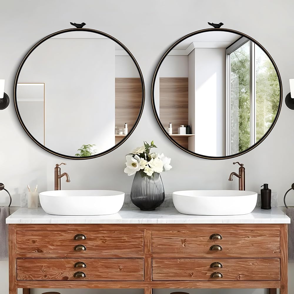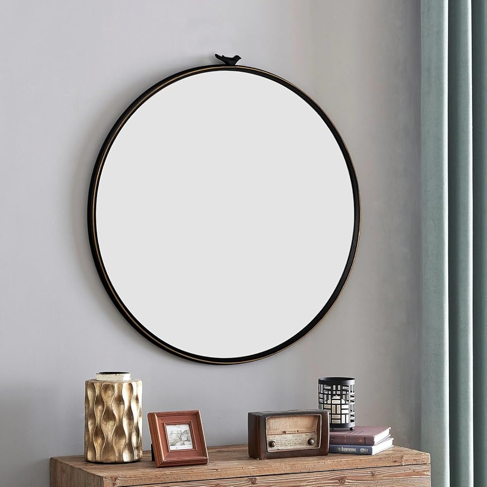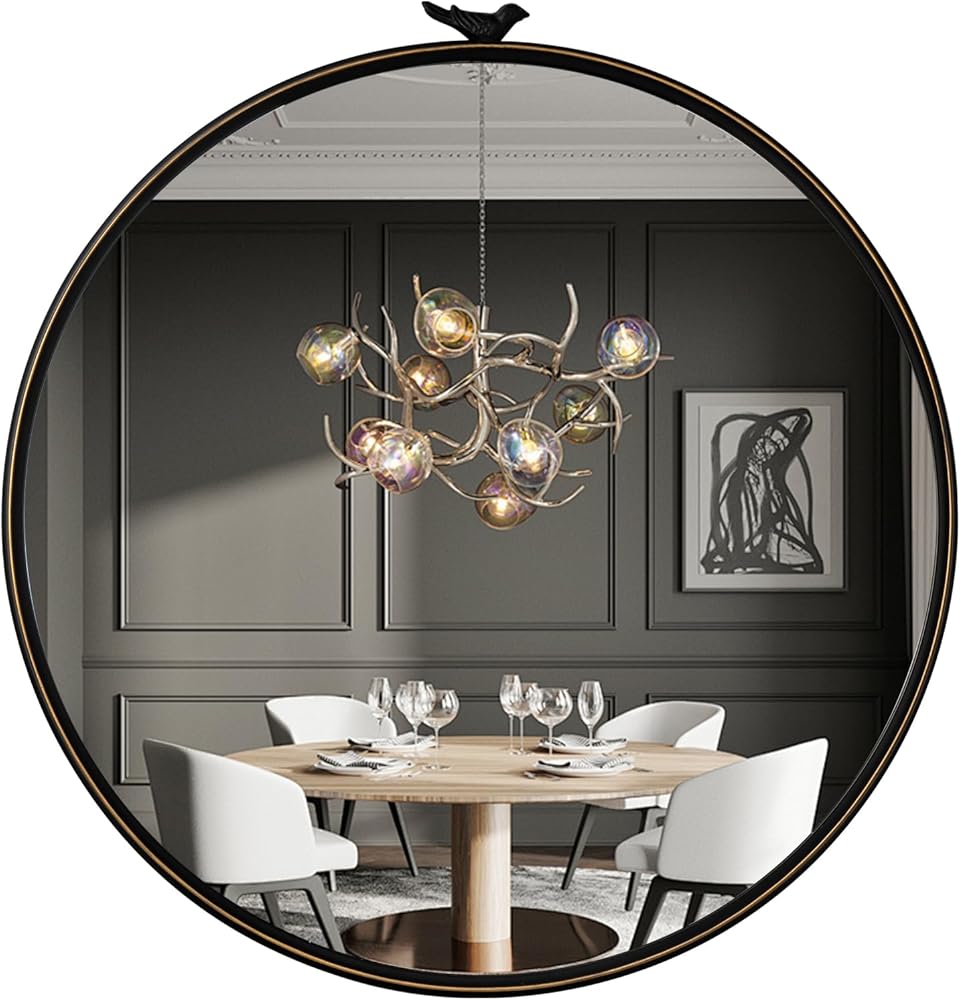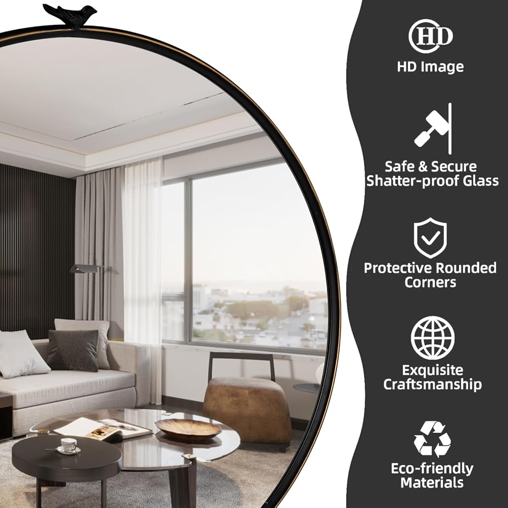 【تصميم رائع لا يتأثر بمرور الزمن】 طائر أنيق في الجزء العلوي بلمسة نهائية سوداء عتيقة، والخطوط الذهبية على الحلقة الخارجية تعزز إحساس الخطوط وتصميم المرآة. المرآة المستديرة هي قطعة خالدة مصممة لرفع مستوى ديكور الحائط الخاص بك.