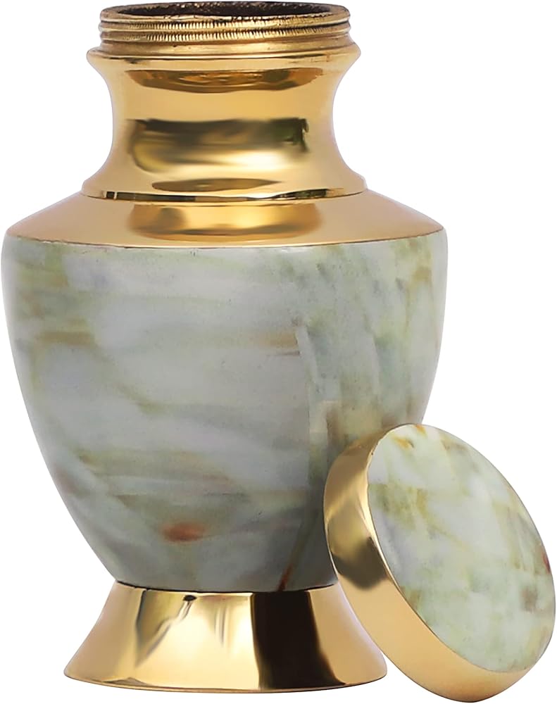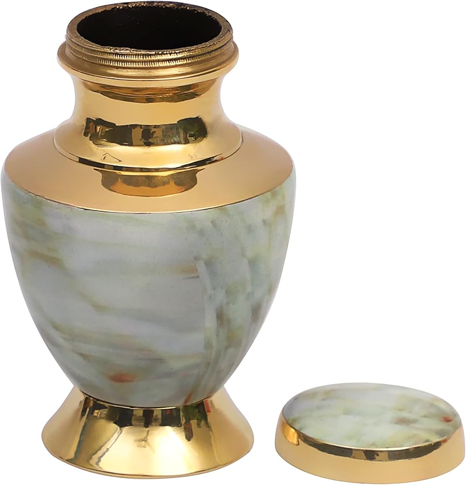 An urn is a vase, often with a cover, with a typically narrowed neck above a rounded body and a footed pedestal. Describing a vessel as an "urn", as opposed to a vase or other terms, generally reflects its use rather than any particular shape or origin. The term is especially often used for funerary urns, vessels used in burials, either to hold the cremated ashes. This Brass Urn comes with top opening with a threaded lid and felt bottom. The Golden Pattern are uniquely engraved by hand for each urn to show beautiful detail giving the FUNERAL URN a unique look to each finished product. Our urns are handcrafted uniquely by an ancient process called sand casting.