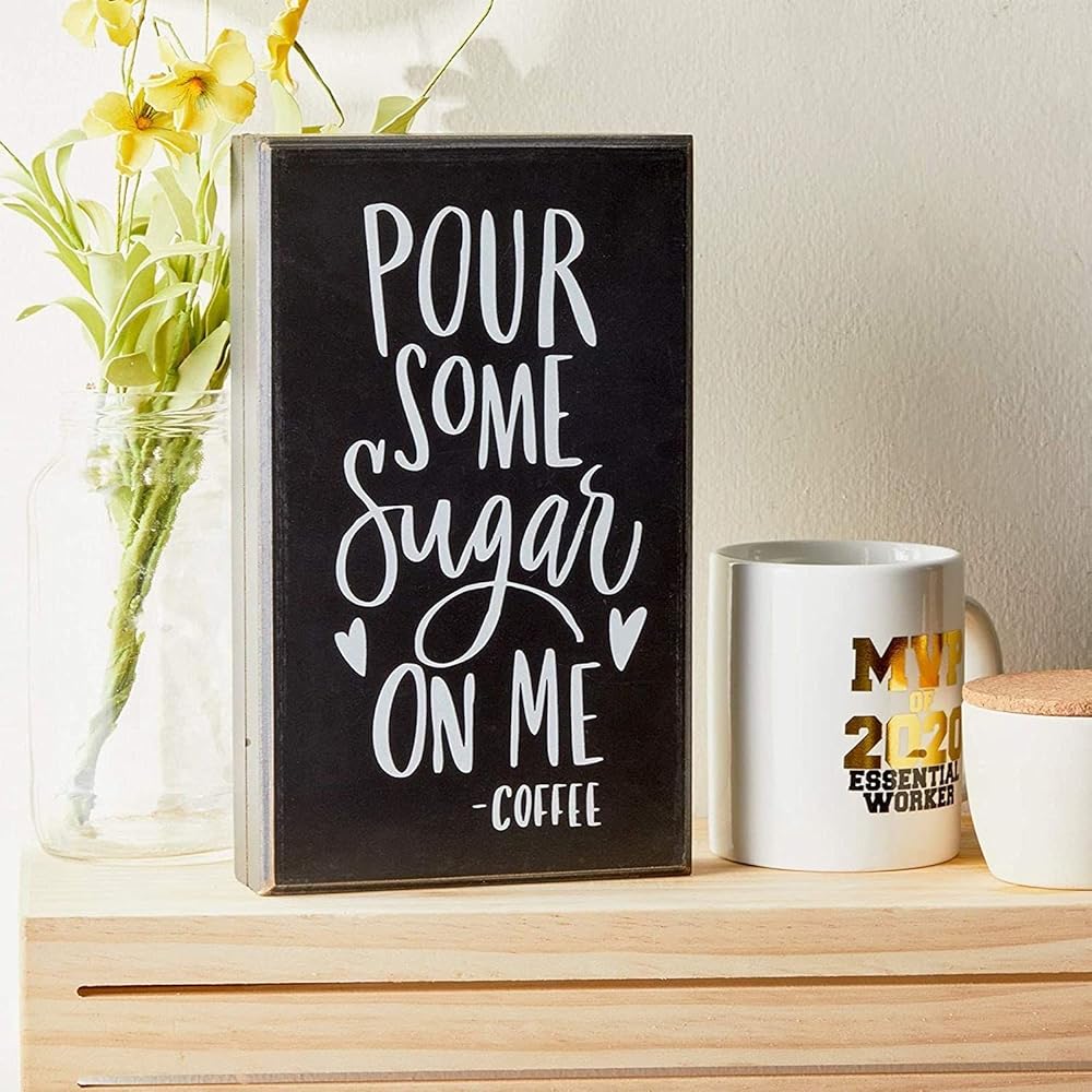 Create a one of a kind gallery wall in your coffee bar and kitchen with this small wooden wall sign that reads "Pour Some Sugar on Me - Coffee". The square wooden sign is made from high-quality, easy to clean medium-density fiberboard that won't easily tarnish. Gift the wooden sign decor to a loved one at an upcoming baby shower, anniversary, or gift exchange, the funny decorative text will effortlessly elevate your home and coffee decor.