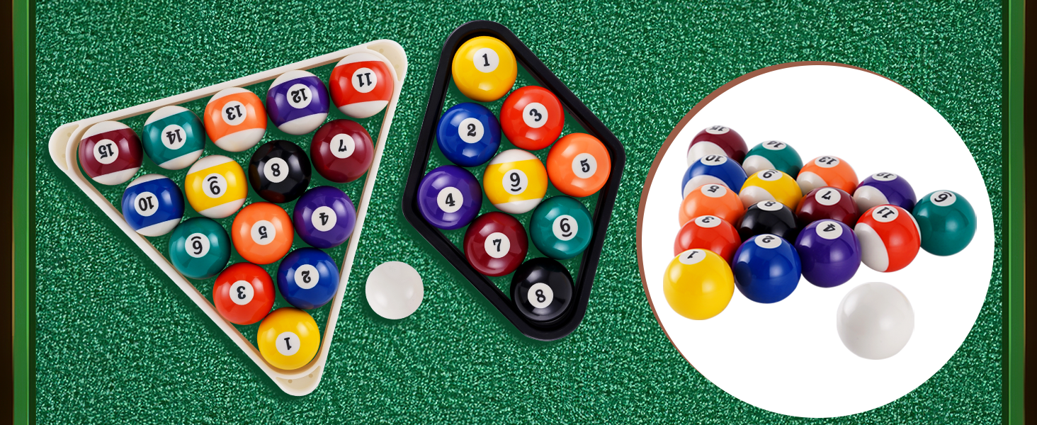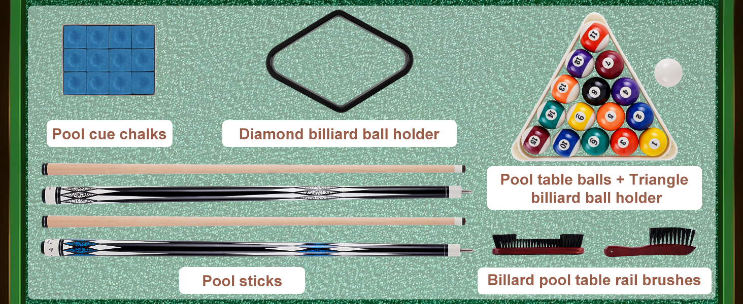 【مجموعة ملحقات البلياردو】: 16 كرة بلياردو، 2 عصا بلياردو، 12 طباشير، رف كرة مثلث، رف كرة ماسي، وفرشتين لطاولة البلياردو.
