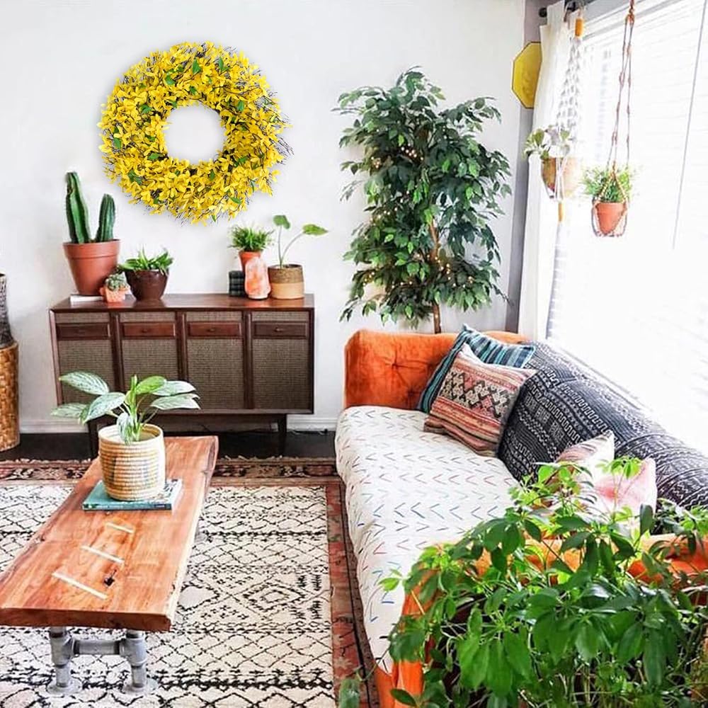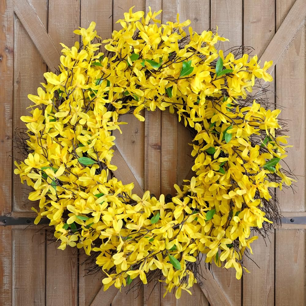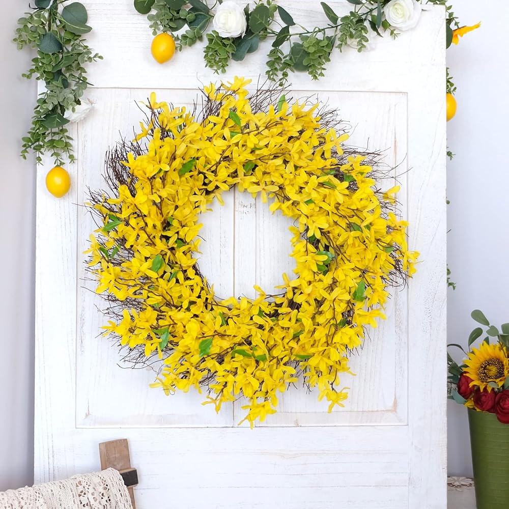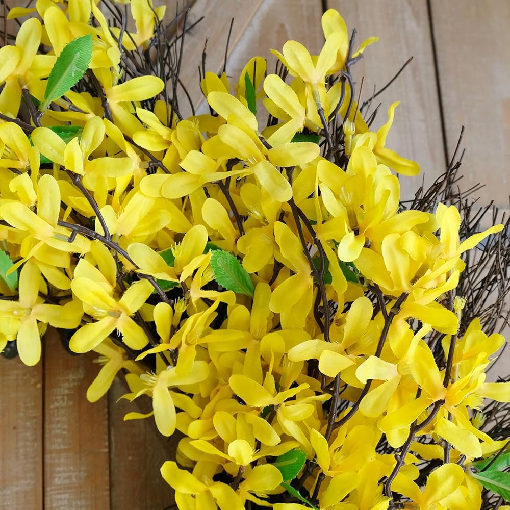[26 Inch Flower Wreath] The Outer diameter of this yellow forsythia flower wreath measures about 26 Inch, this is a nice looking fasten spring wreath for home decoration, this wreath is a good choice to hang all of the doors of your home and it is a good choice to decorate the yard.