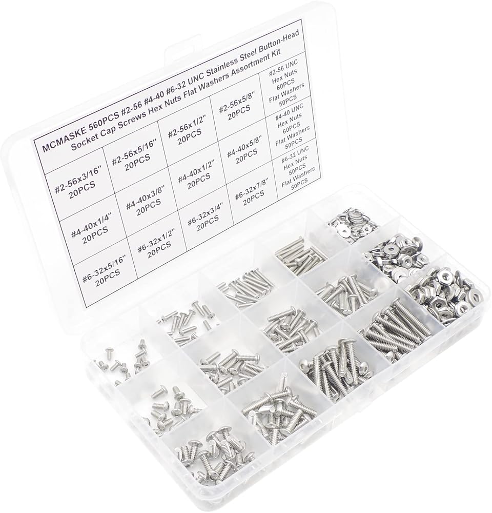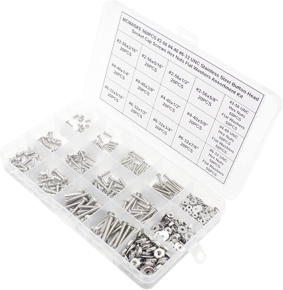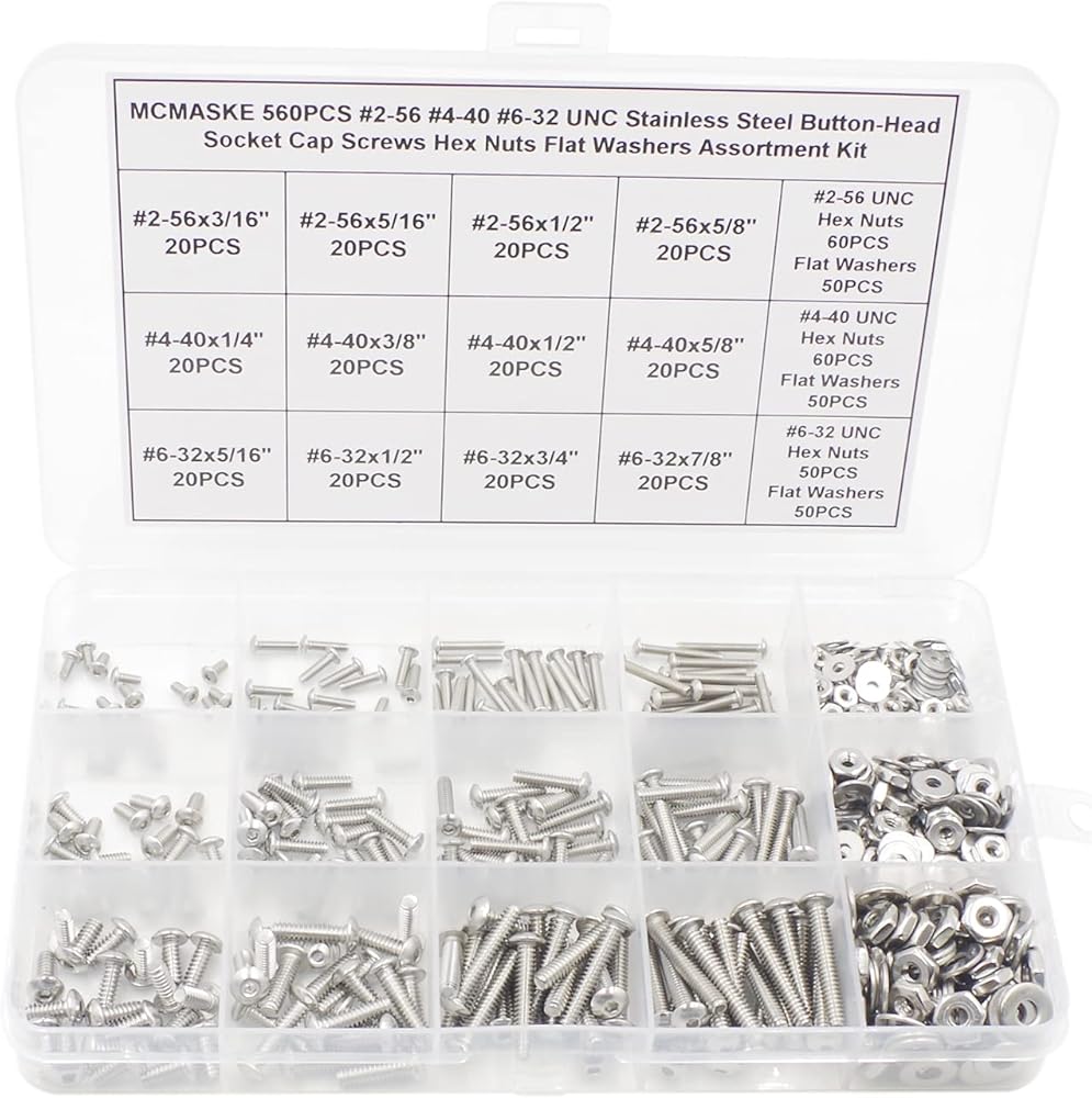 MCMASKE 560PCS #2-56 #4-40 #6-32UNC 304 Stainless Steel Button-Head Socket Cap Screws Hex Nuts Flat Washers Kit