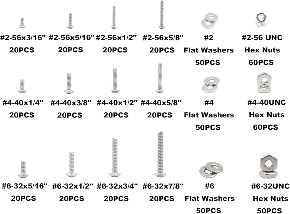 Screws have Different length:#2-56x3/16",5/16",3/8";1/2";#4-40x1/4",3/8",1/2",5/8";#6-32x5/16",1/2",3/4",7/8" ,Full Thread length,Length is measured from under the head,Each 20 Pieces