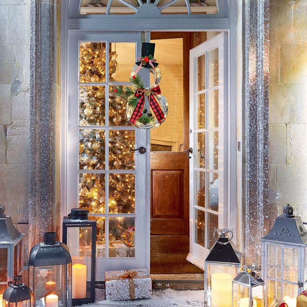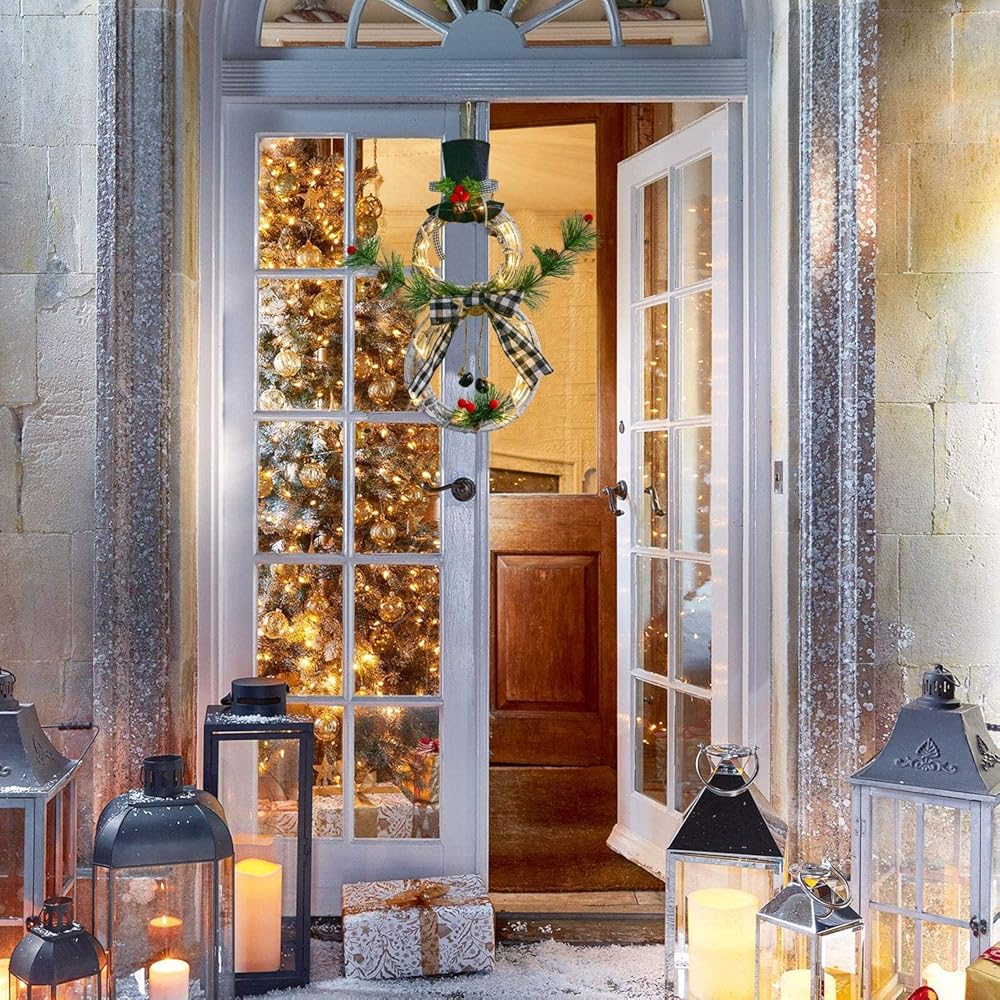 DearHouse 16inch Christmas Snowman Wreath with 15 LED Lights