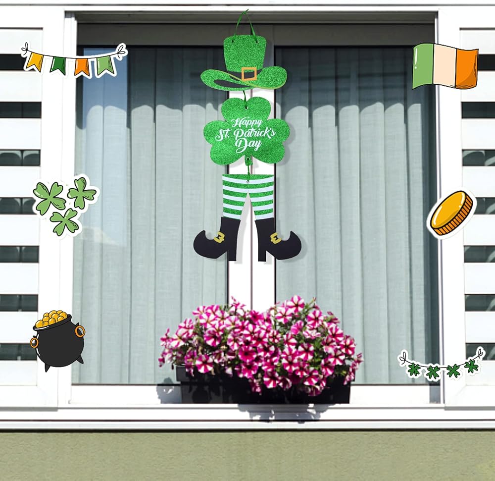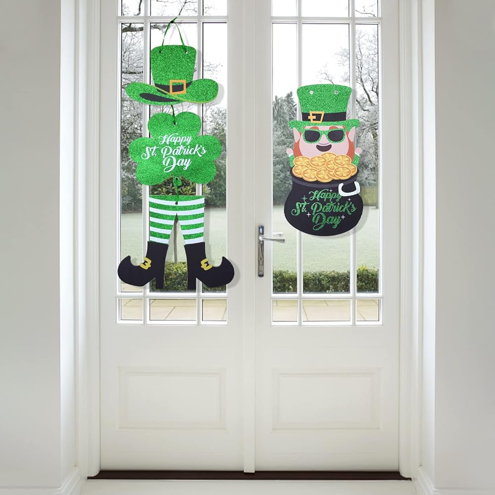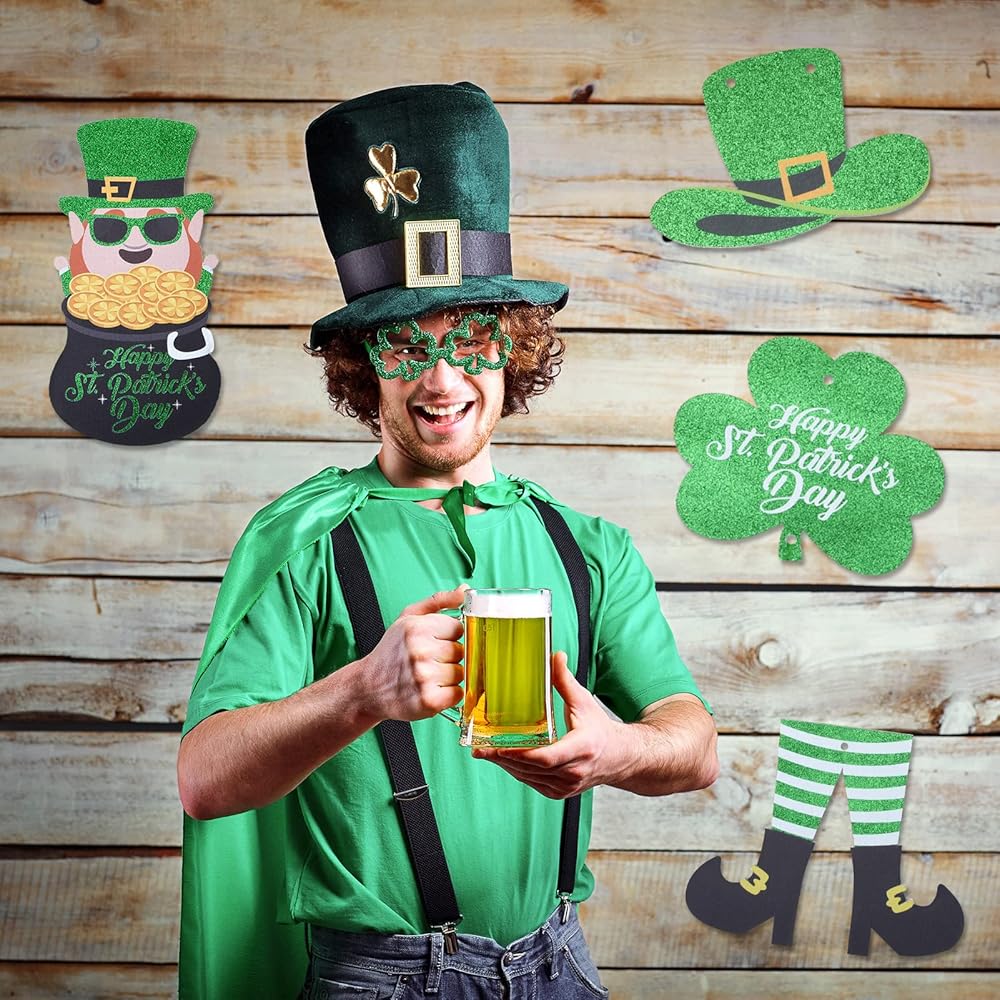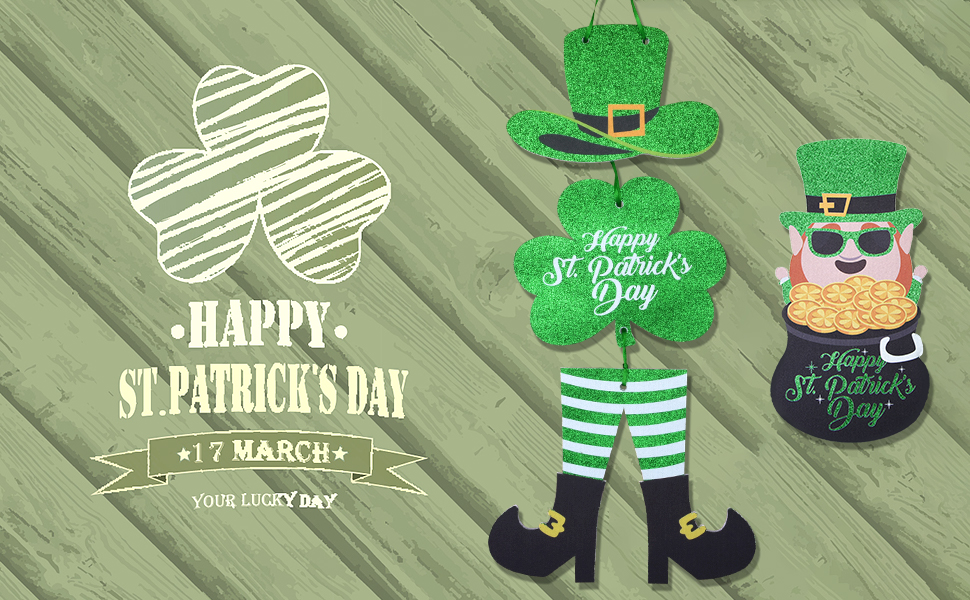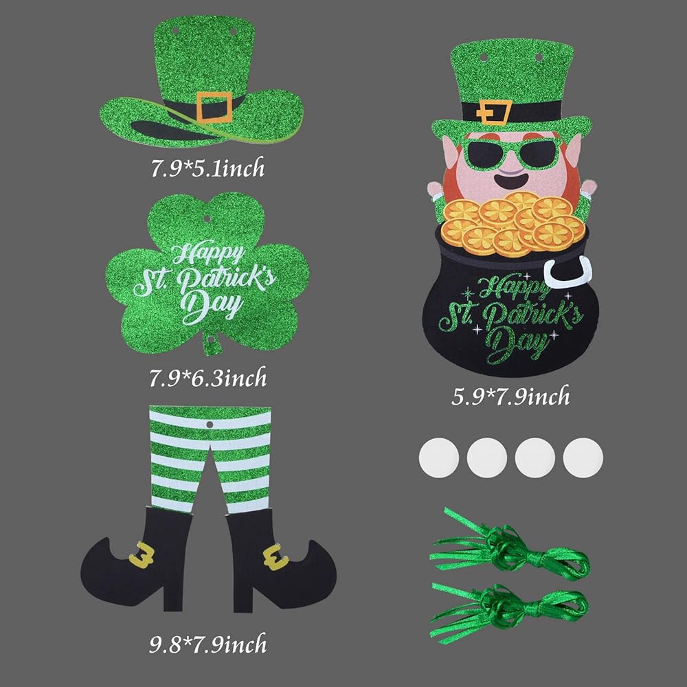 يتضمن المنتج: سوف تحصل على ديكور علامات عيد القديس باتريك، وتشمل العناصر نبات النفل وقبعة الجني والقدمين، بالإضافة إلى الكلمات Happy St. Patrick's Day، المليئة بالعناصر التقليدية لعيد القديس باتريك واللون الأخضر الكلاسيكي، احتفل بعيد القديس باتريك بطريقة كلاسيكية.