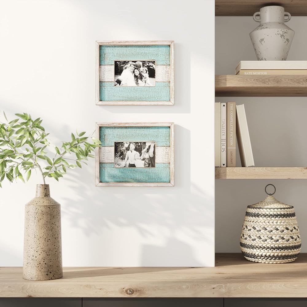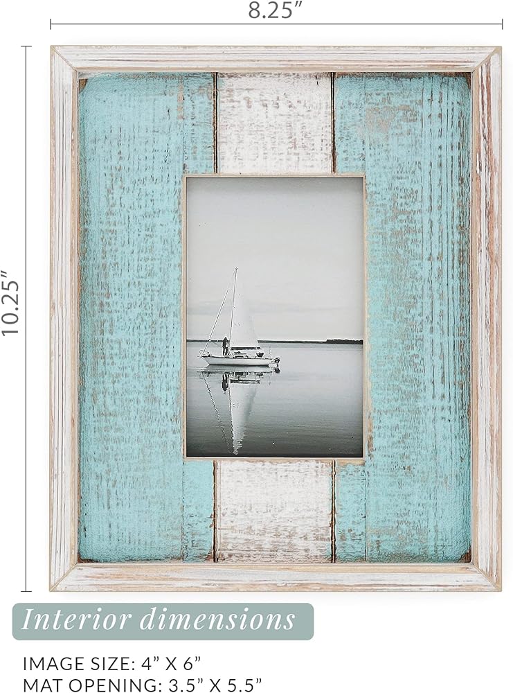 الأبعاد - المادة: إطار صورة خشبي لمنزل المزرعة. حجم الصورة: 4 × 6 بوصة. مقاس السجادة: 3.5 سم × 5.5 سم. الحجم الكلي: 8.25 بوصة × 0.75 بوصة 10.25 بوصة. اللون: أبيض/فيروزي. سطح الطاولة أو التعليق على الحائط. اتجاه عمودي أو أفقي. عبوتان.