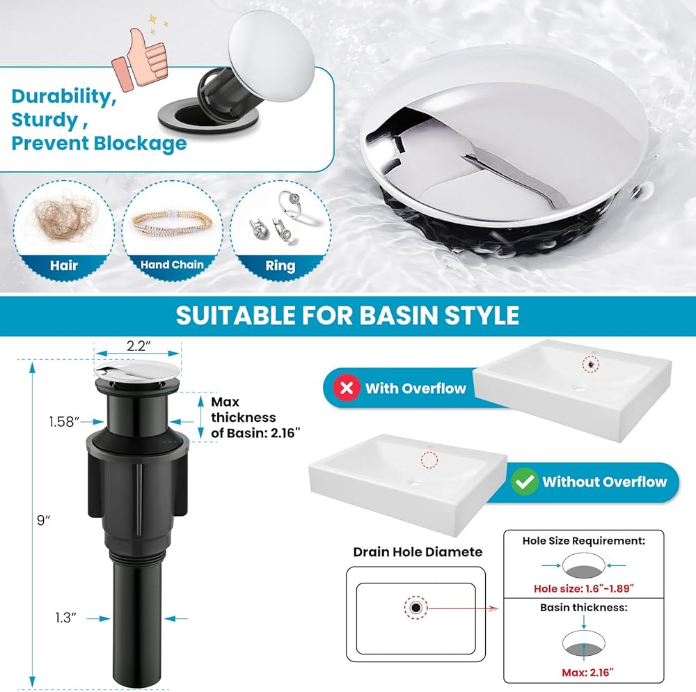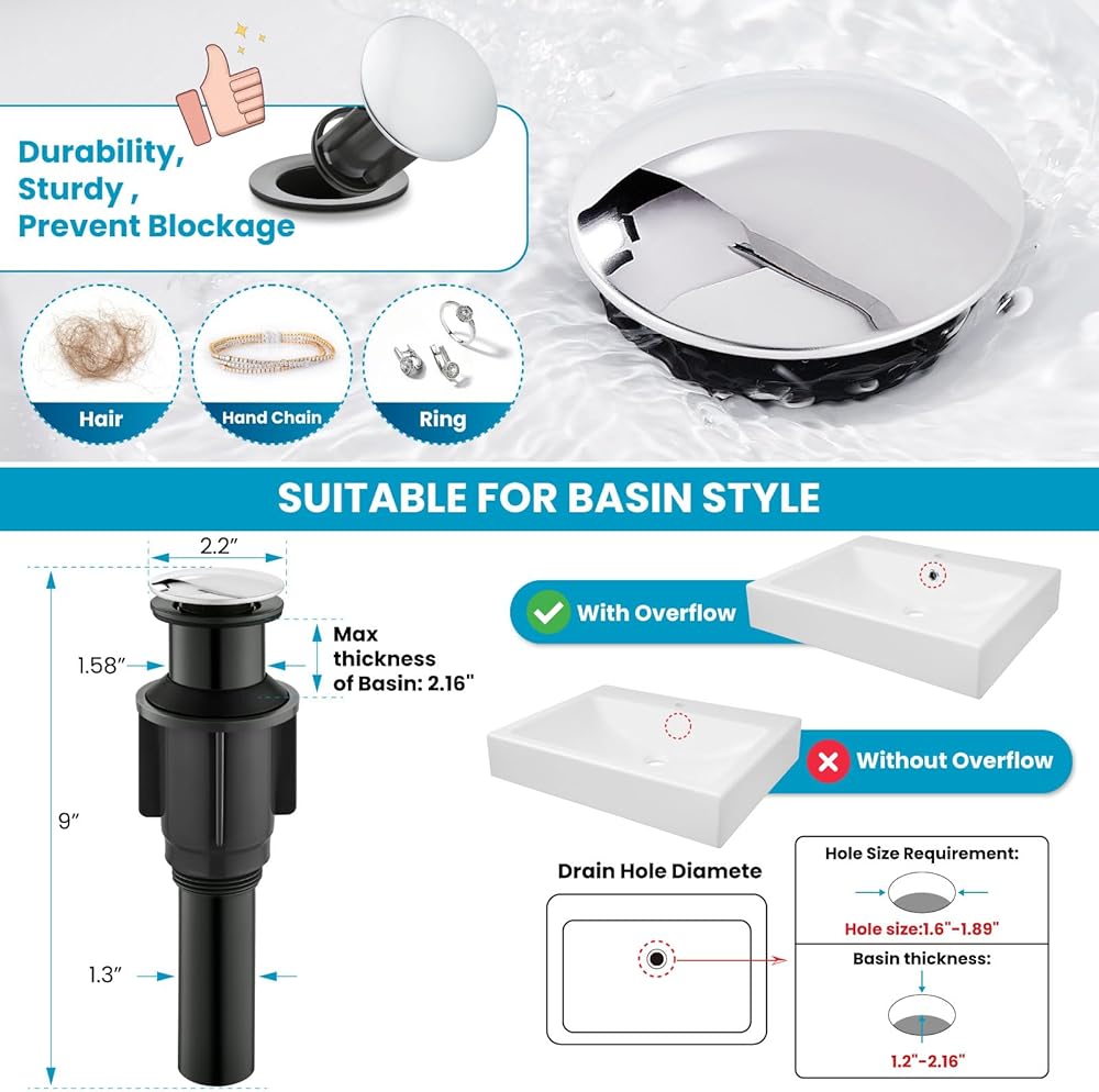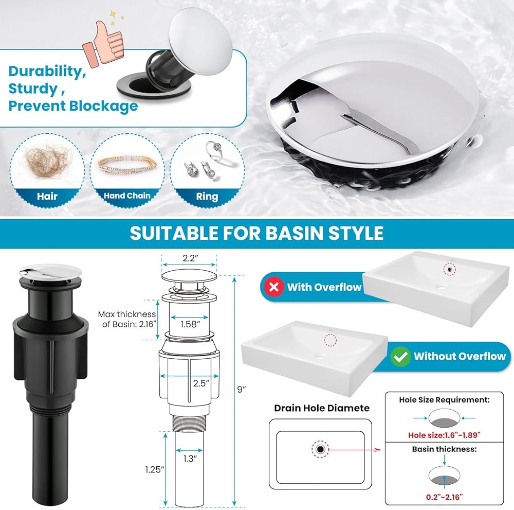 [قطر فتحة الحوض]: فتحة صنبور حوض الحمام: 0.98 بوصة - 1.5، يمكن تركيب صنبور الحوض هذا أو يمكنك ثقب فتحة. هذا الصنبور ذو الفتحة الواحدة مناسب للغسيل والبار وأحواض المنزل المتنقلة.