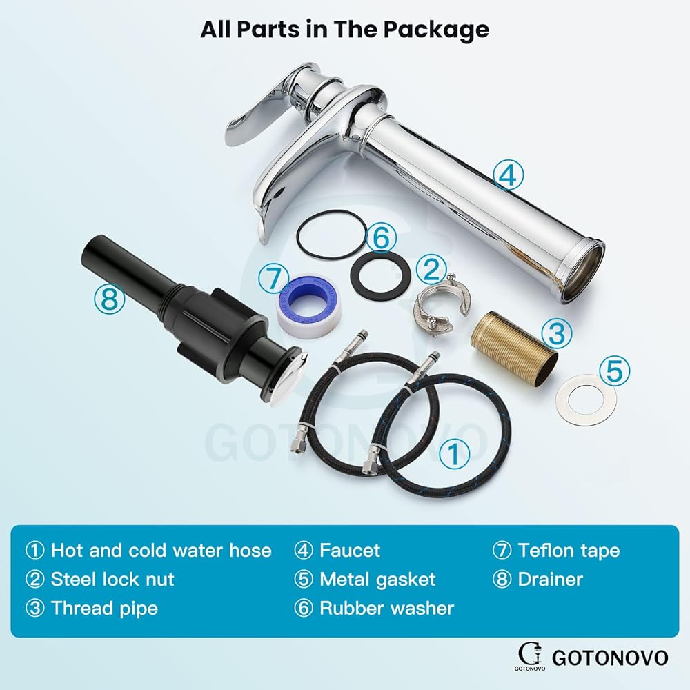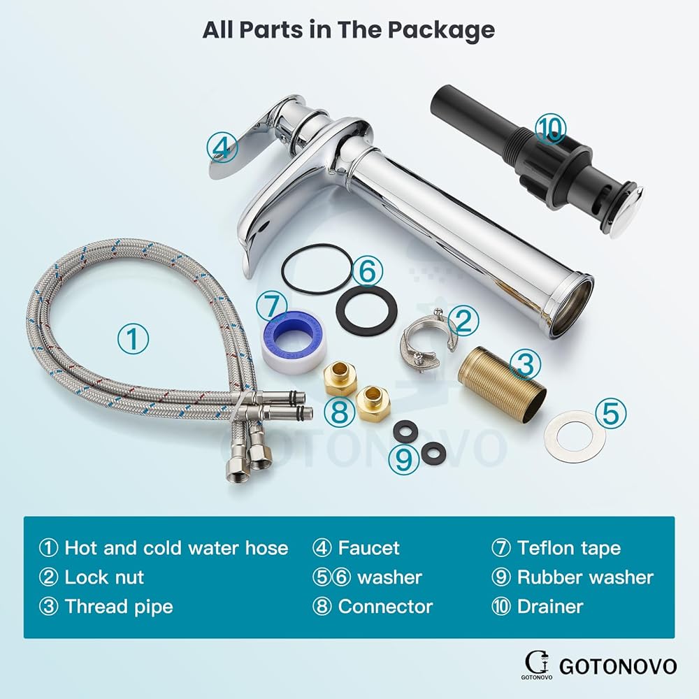 [ما ستحصل عليه من صنبور حوض الحمام الطويل]: جسم صنبور حوض الحمام الطويل، خرطوم مرن للمياه الباردة والساخنة، تصريف منبثق، التعليمات والموصلات محول ذكر 3/8 بوصة - أنثى 1/2 بوصة لتلبية المتطلبات المختلفة