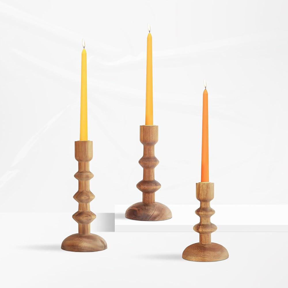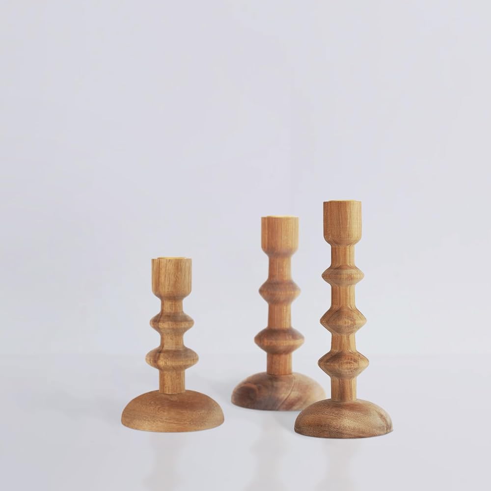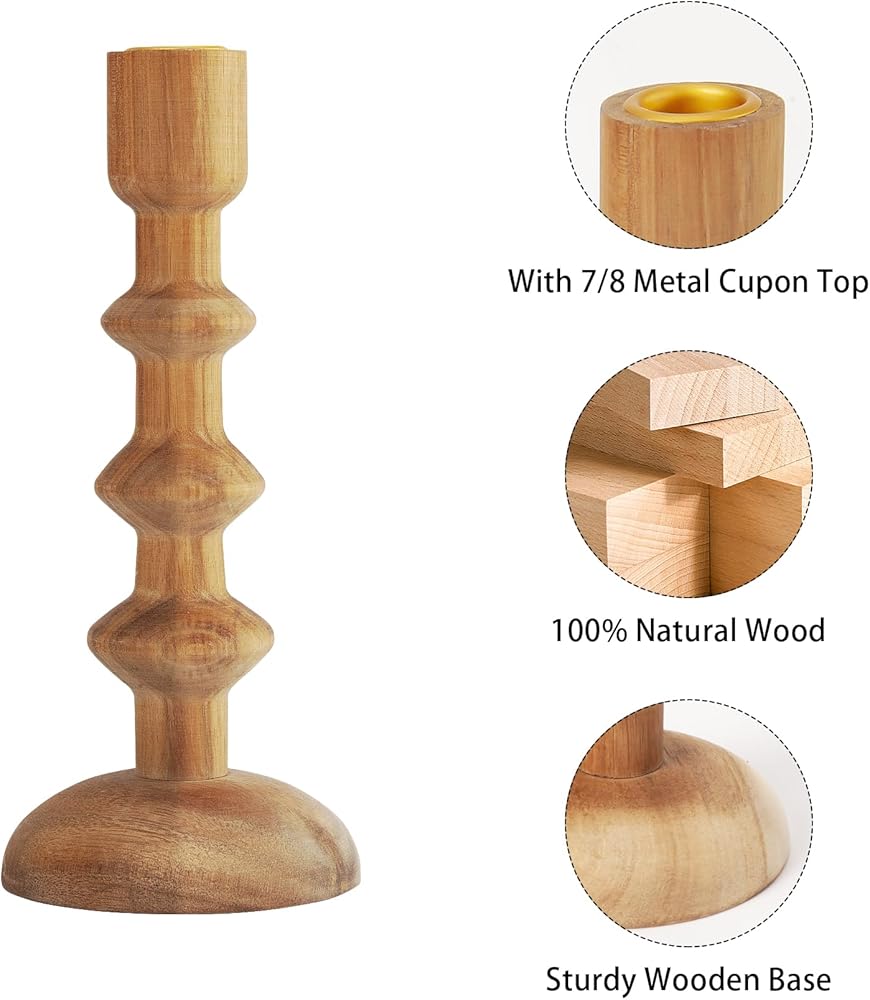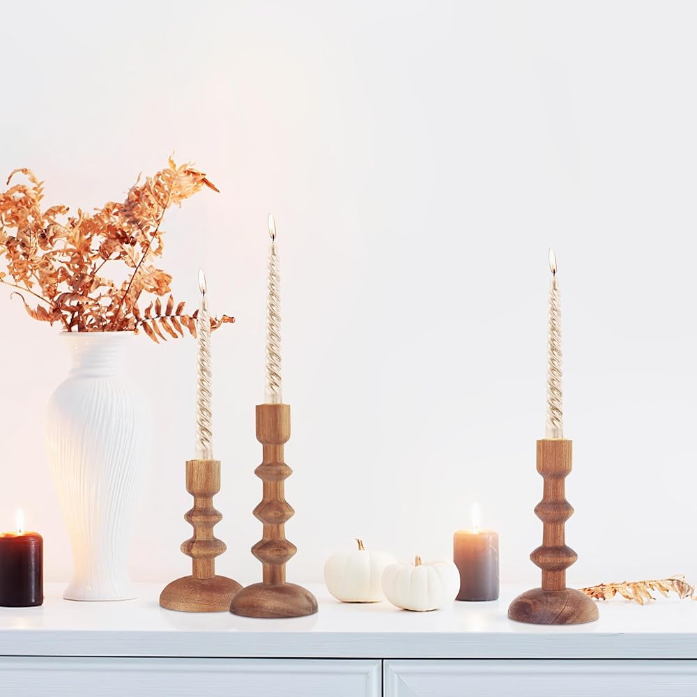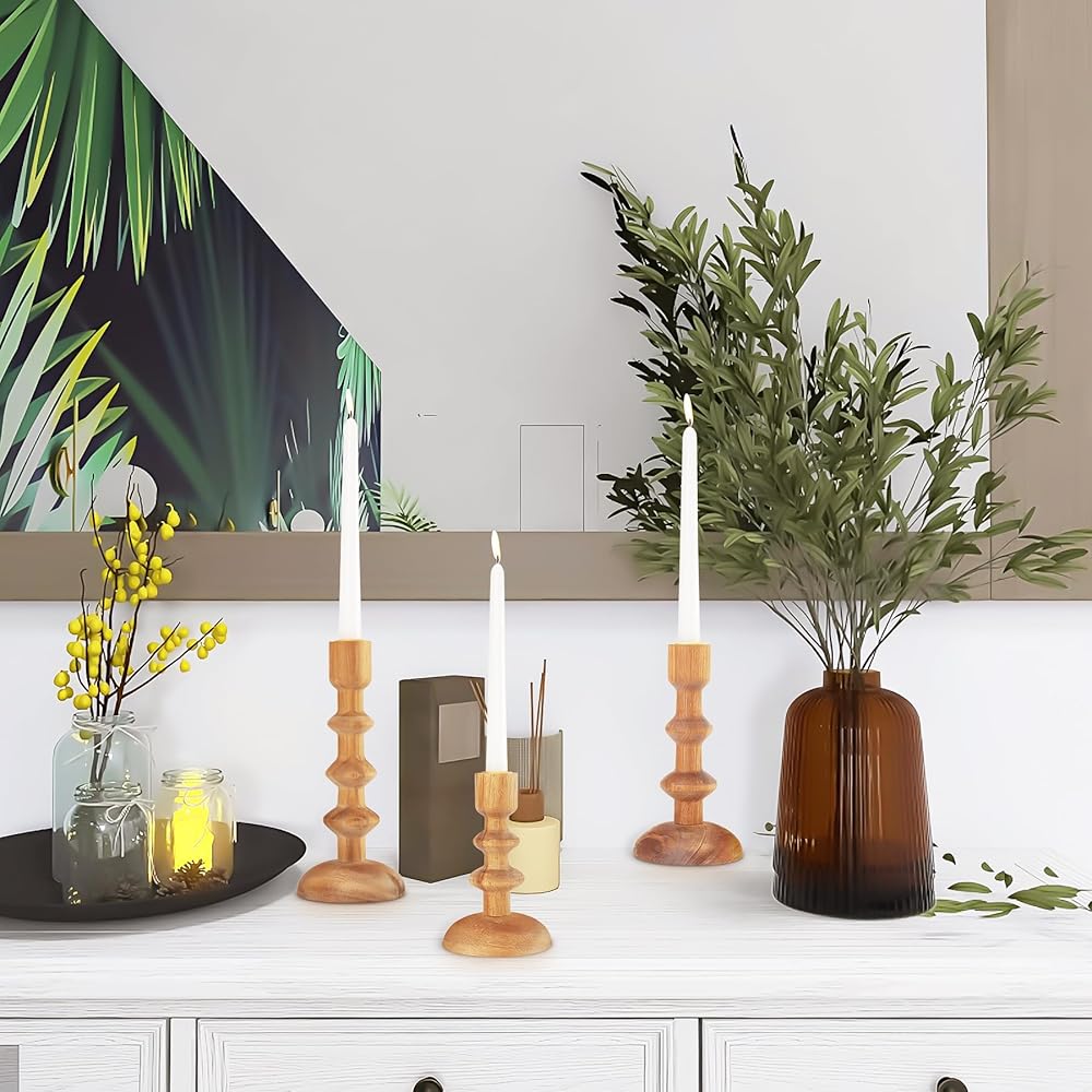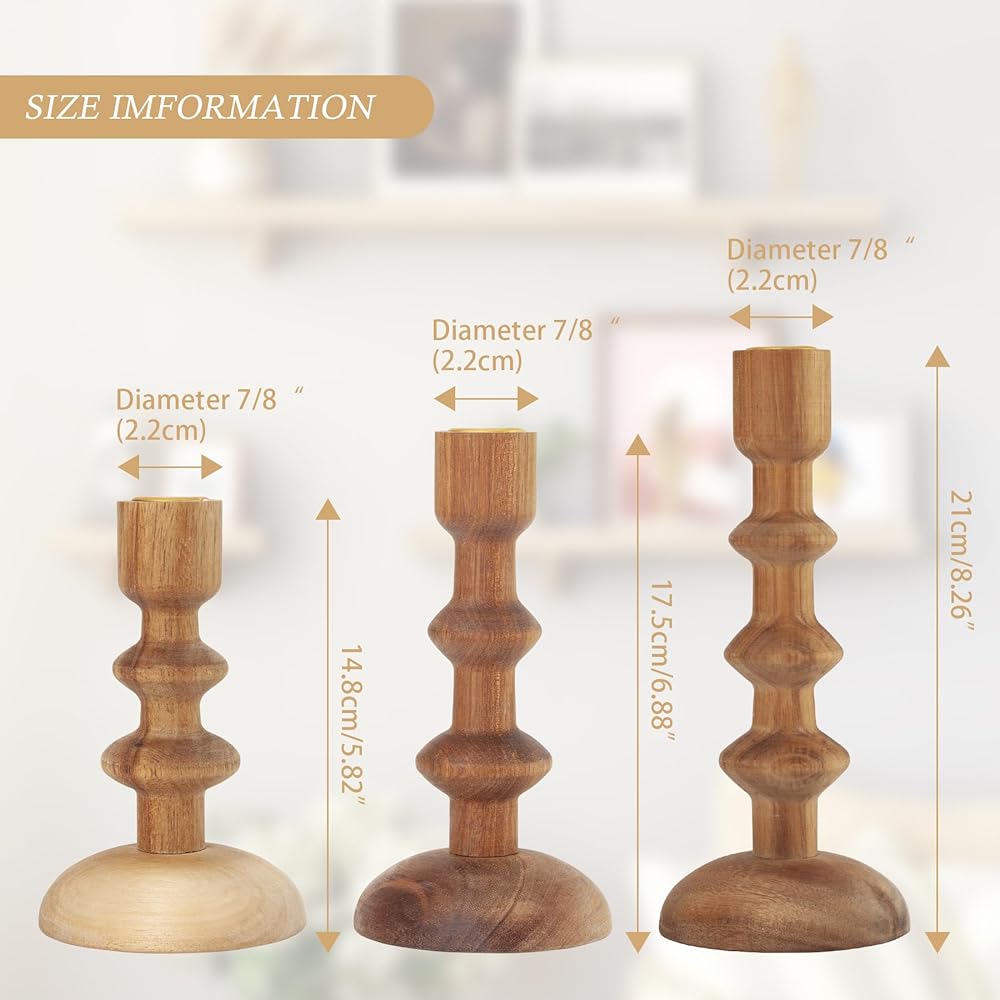 ✔️【Decorative Rustic Wood Pillar Candle Holders】This candlesticks holders set comes with 3 different size: 5.82",6.88", 8.26" of wooden candle stands that can fit a 7/8" diameter candle. Display our candle holders on tabletop of the mantel or any room.No assembly required. Candle holders only, candles are not included.