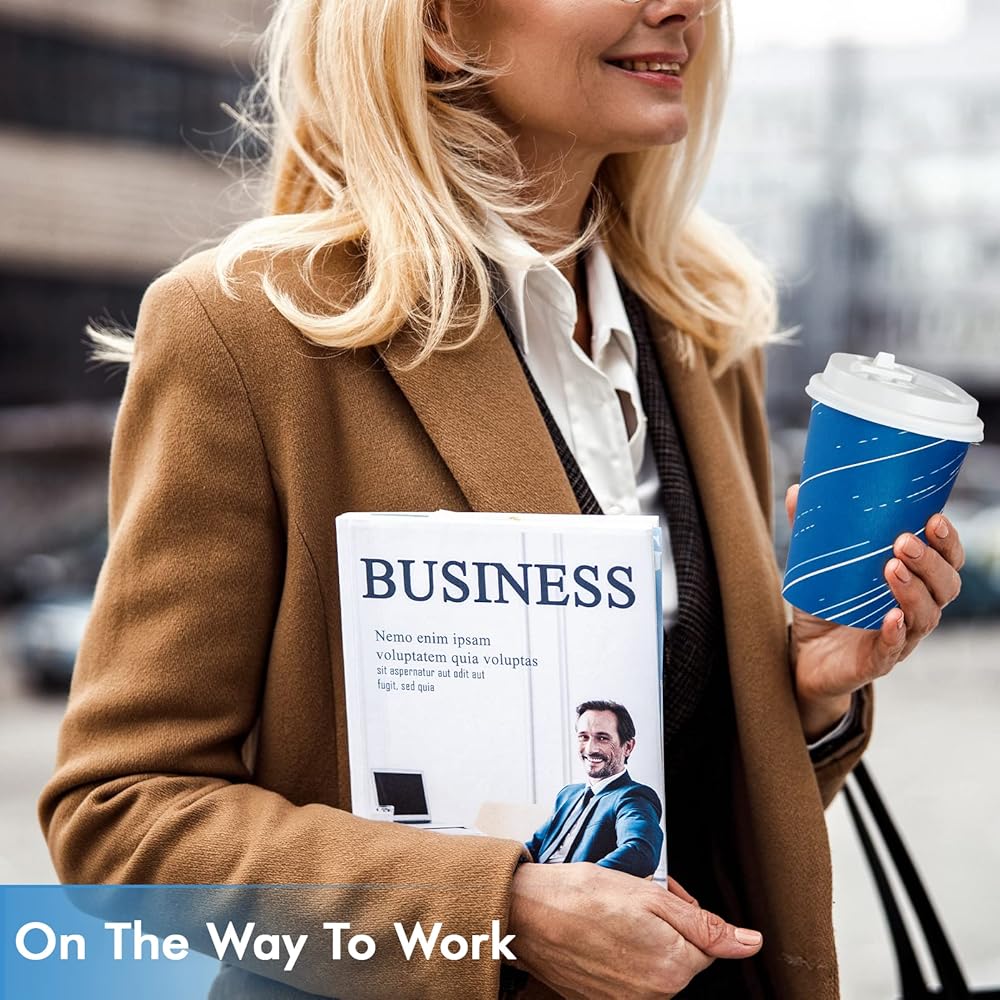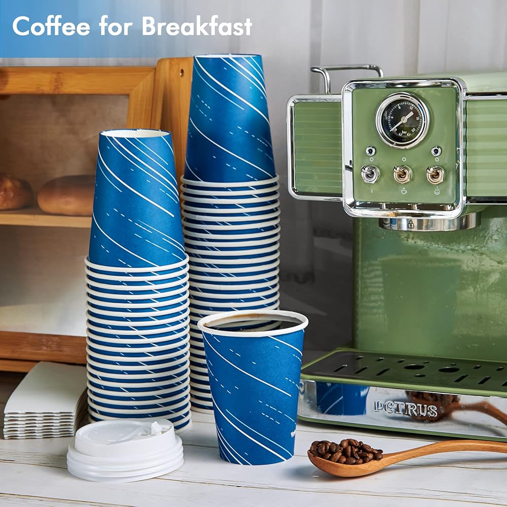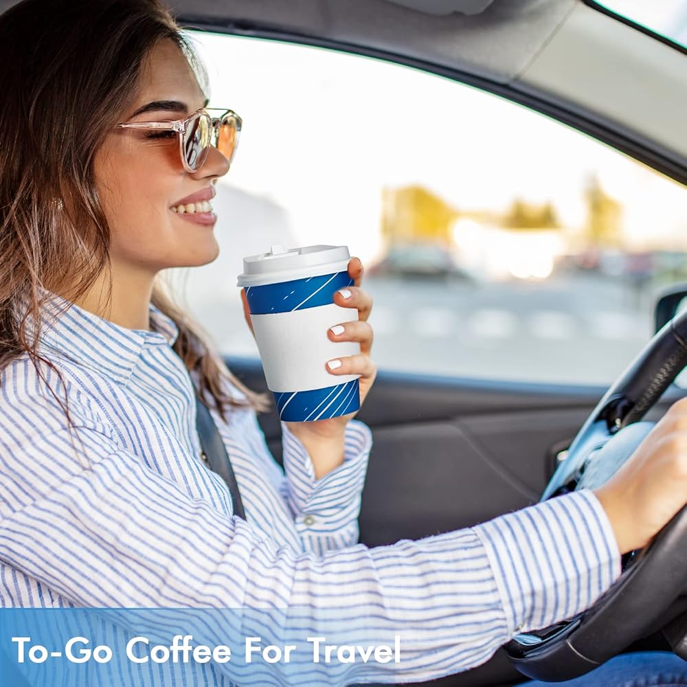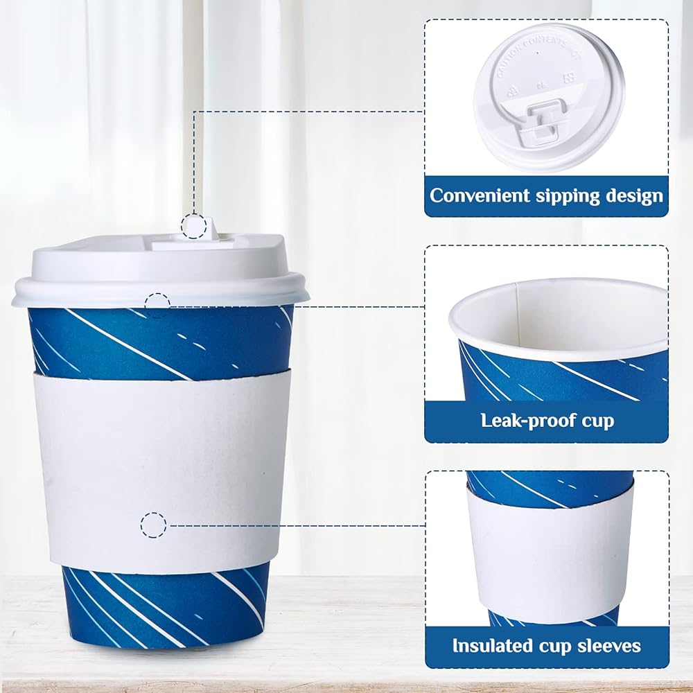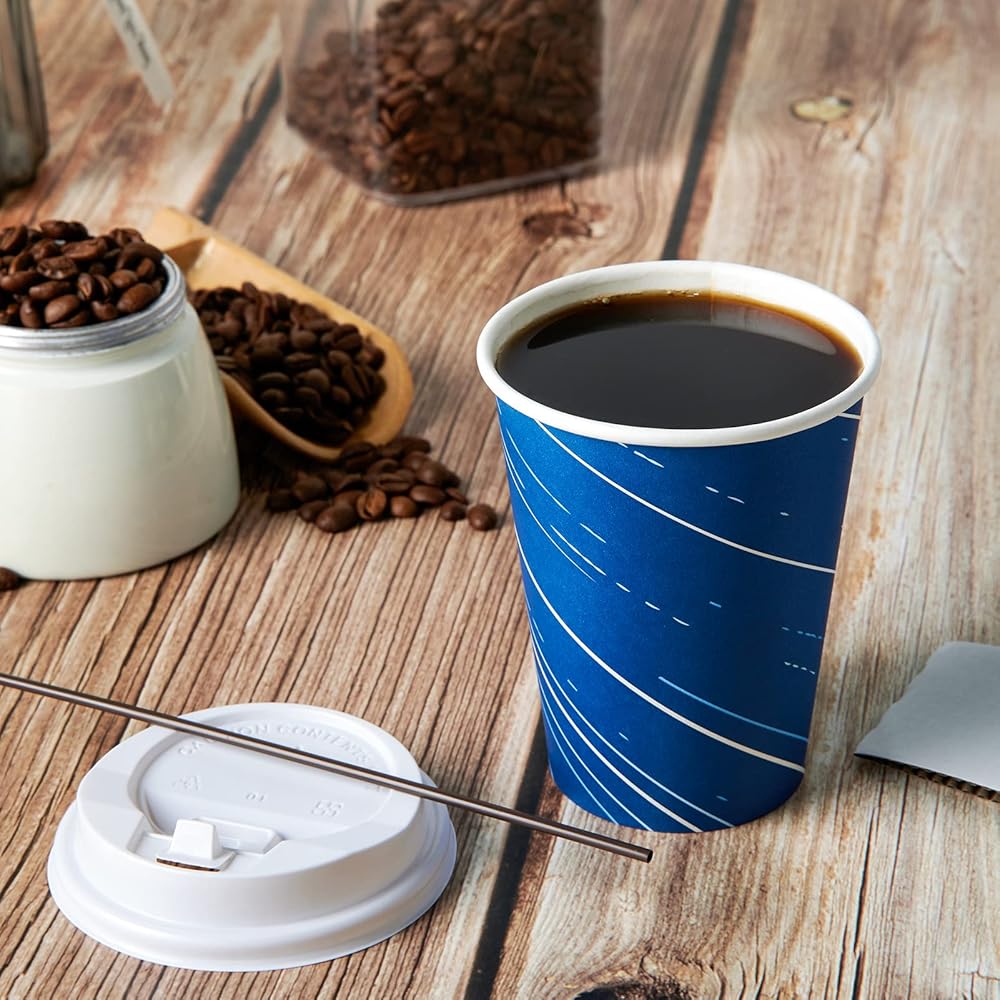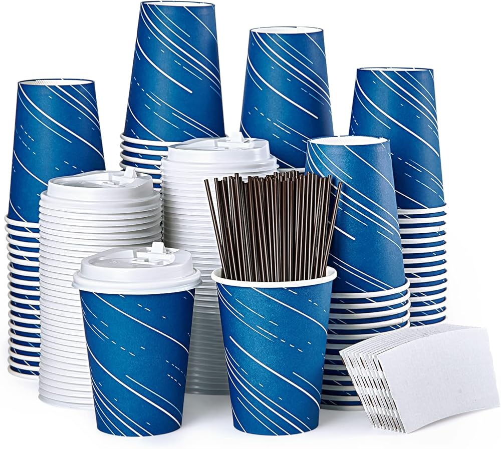عبوة قيمة للغاية: تتضمن أكواب القهوة الكبيرة 100 كوب قهوة أزرق، و100 عبوة من الأغطية البيضاء المتطابقة، و100 أكمام أكواب معزولة، و100 شفاطة.