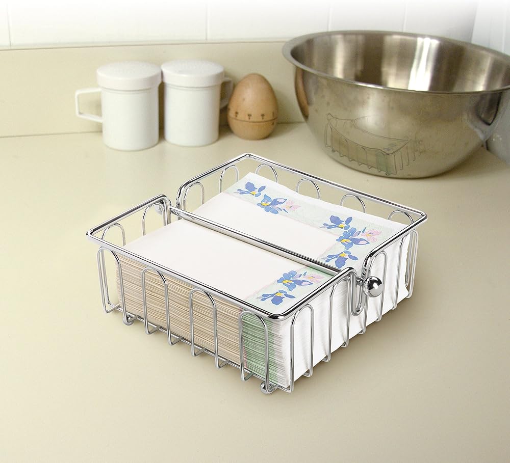 Store and display your napkins, without worrying about them blowing away! Fox Run's Wire Napkin Holder combines style, convenience, and functionality. Constructed of high quality, sturdy steel with a sleek, shiny chrome finish, this napkin holder features a removable metal arm, which acts as a paperweight to keep your napkins secure and intact. This makes it perfect for both indoor family meals and outdoor summer barbecues! The holder stores napkins flat/horizontally, so it's a breeze to refill and dispense a single napkin when needed. No need to fold them in half and no messy, sagging napkins like in a vertical holder. Keep paper napkins at easy reach and ready to use during your meals with this decorative, practical piece.