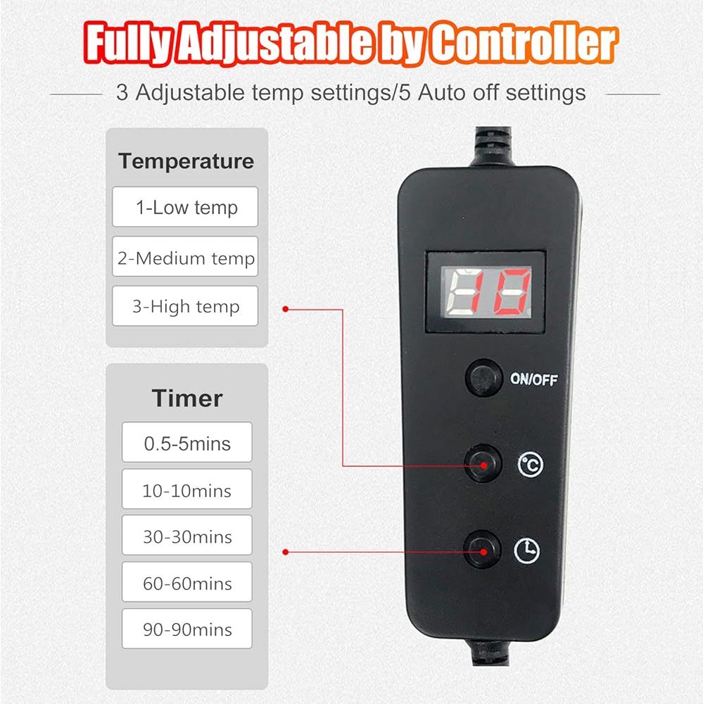 [درجة حرارة ومؤقت قابلان للتعديل] نطاق درجة حرارة التسخين هو 35 درجة مئوية - 60 درجة مئوية مع 3 مستويات قابلة للتعديل، يمكنك الاختيار وفقًا لتفضيلاتك الشخصية. 5 مستويات للتوقيت، سيتم إيقاف تشغيل غلاف التسخين تلقائيًا بعد 5 دقائق إلى 90 دقيقة، ويمنع ارتفاع درجة الحرارة ويحمي منزلك من الحوادث والإصابات. جهد آمن 24 فولت، استمتع بالدفء بأقل إشعاع