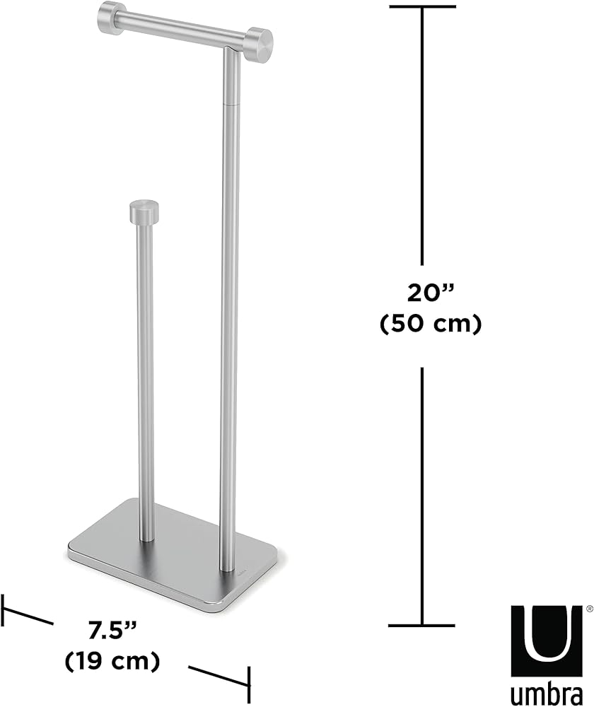 • SMALL FOOTPRINT: Cappa toilet paper stand and reserve is freestanding yet takes up little space, measuring 7.7 x 5 x 21 inches (19.5 x 12.7 53 cm)
