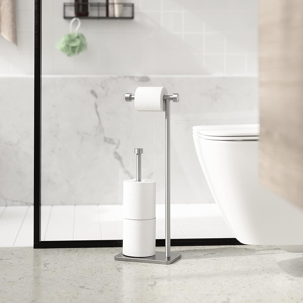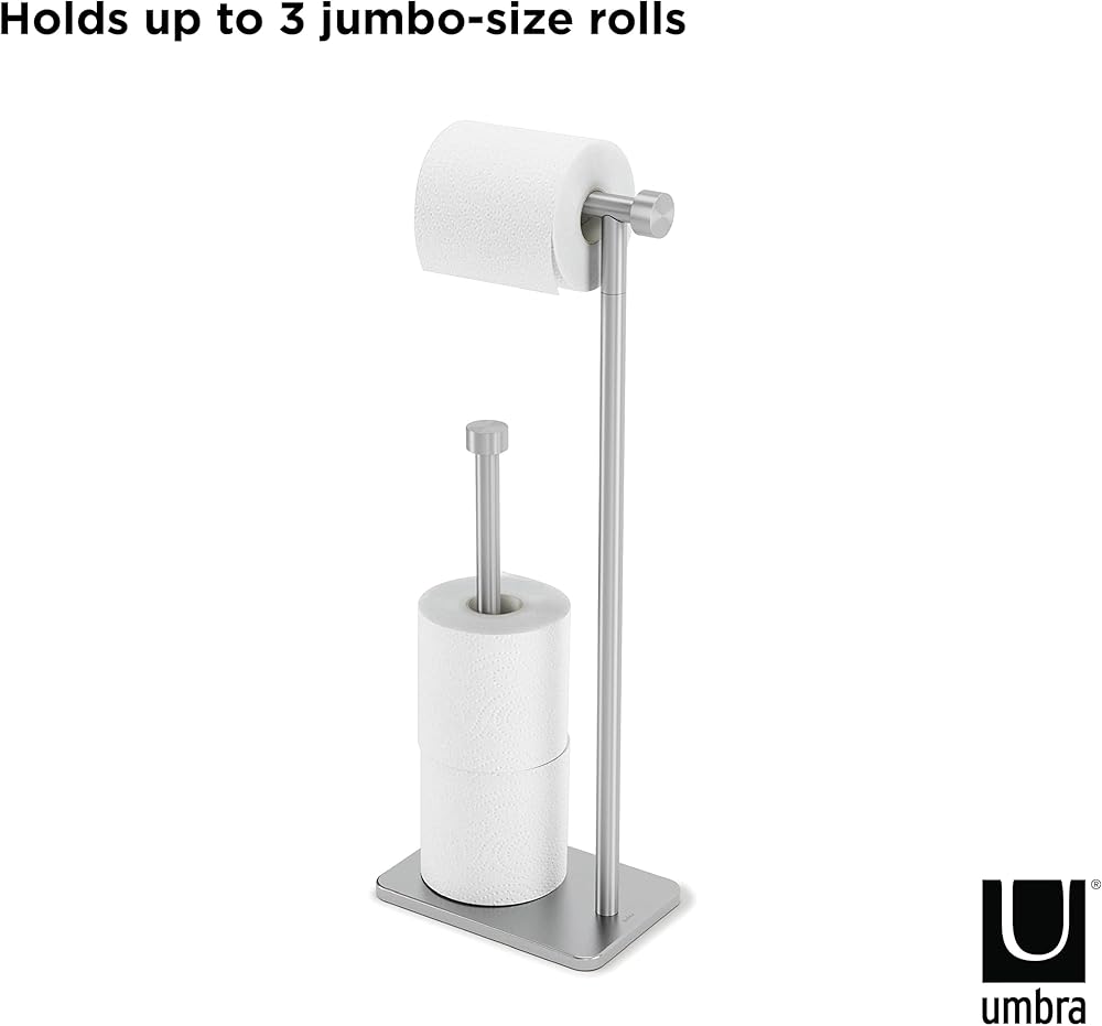 • EASY STORAGE: This two-in-one toilet paper holder and reserve can store up to 3 jumbo size rolls and has an elevated base to ensure they don't touch the ground