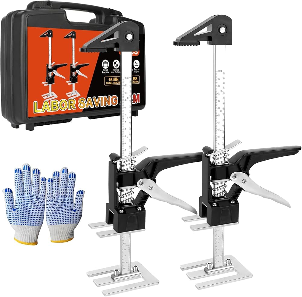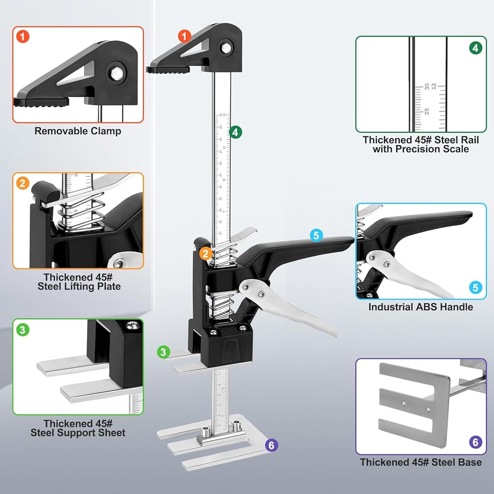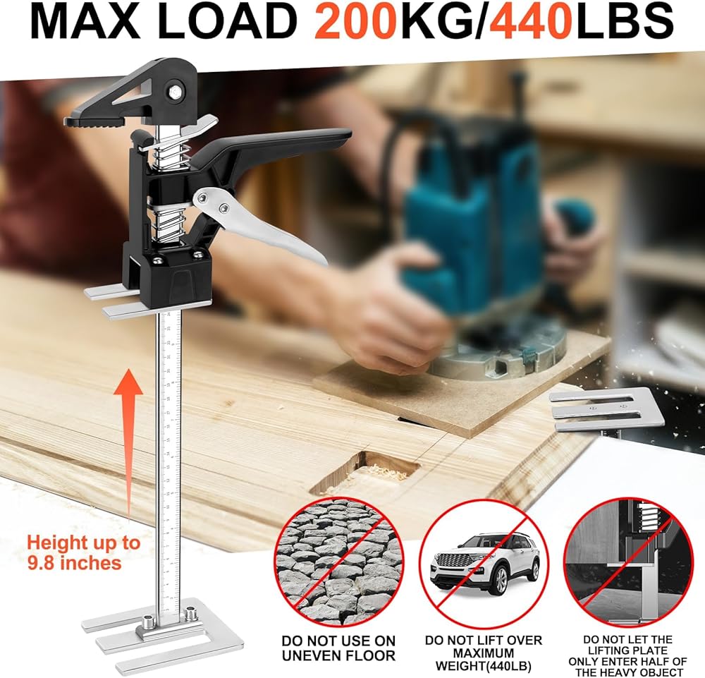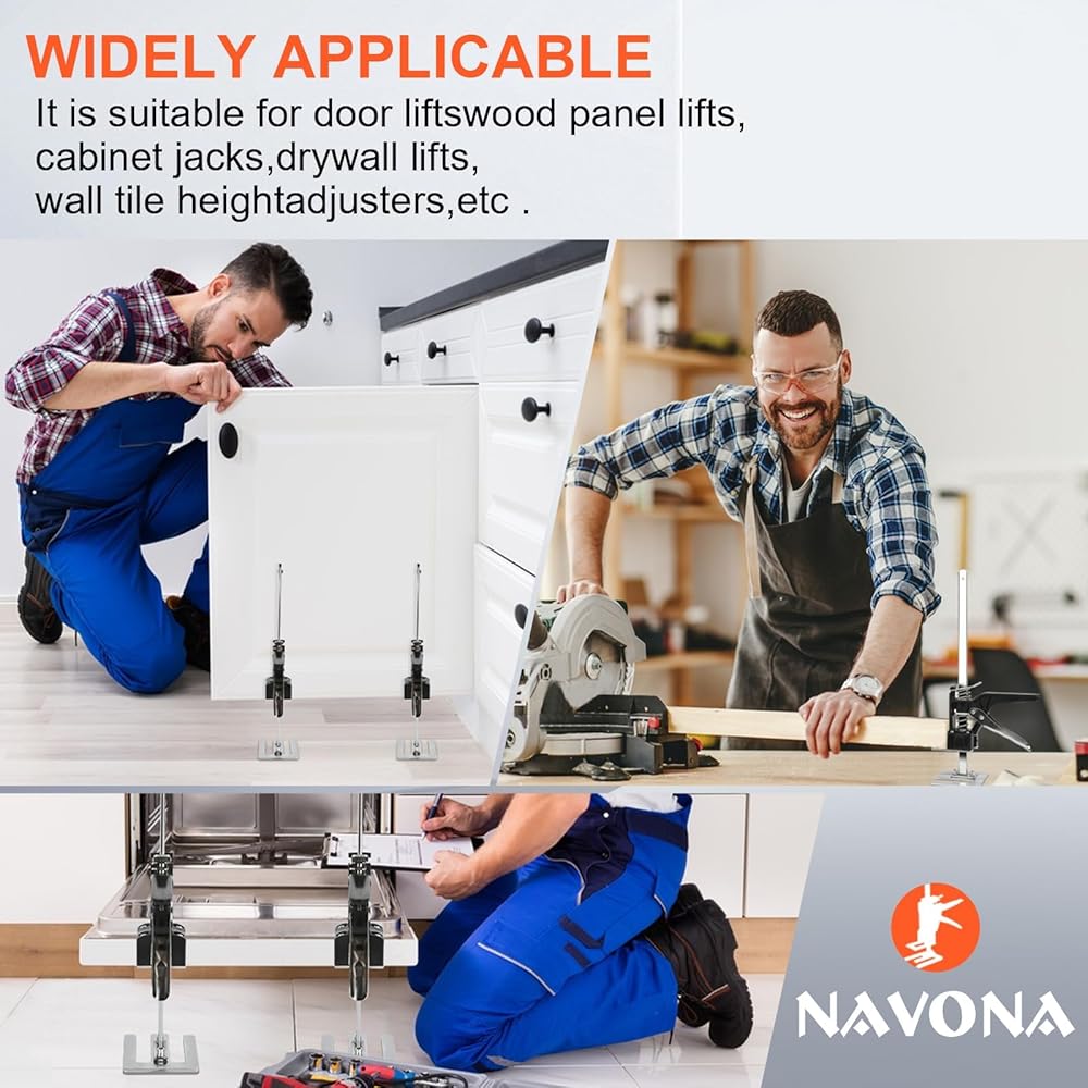 • ✅ 【Wide Use】Hand effort elevator can be used in various scenarios in life, It suitable for cabinet jacks, door lifts, drywall lifts, floor jacks, wall tile height, wood panel lifts. The height can be easily adjusted by pressing the handle.