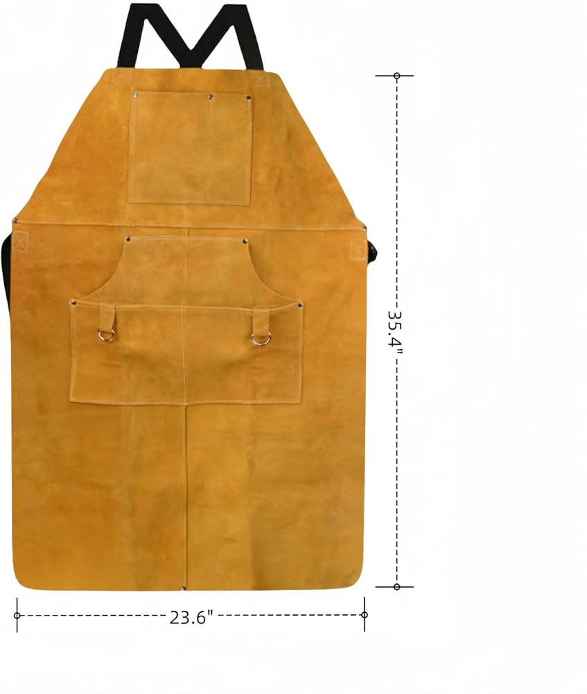 Nice welding protection Size: The apron measures 23.6 inches Wide x 35.43 inches Tall, providing full coverage of your chest, waist, legs, thighs and knees.
