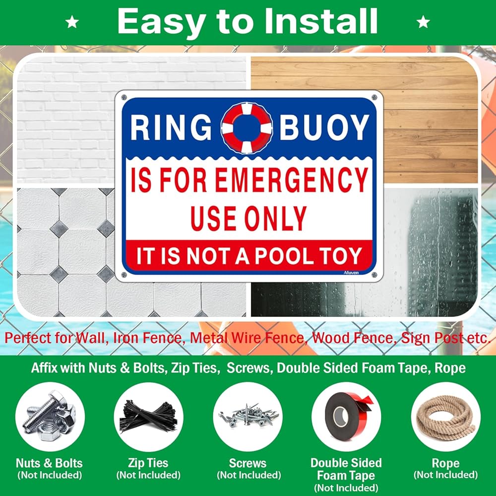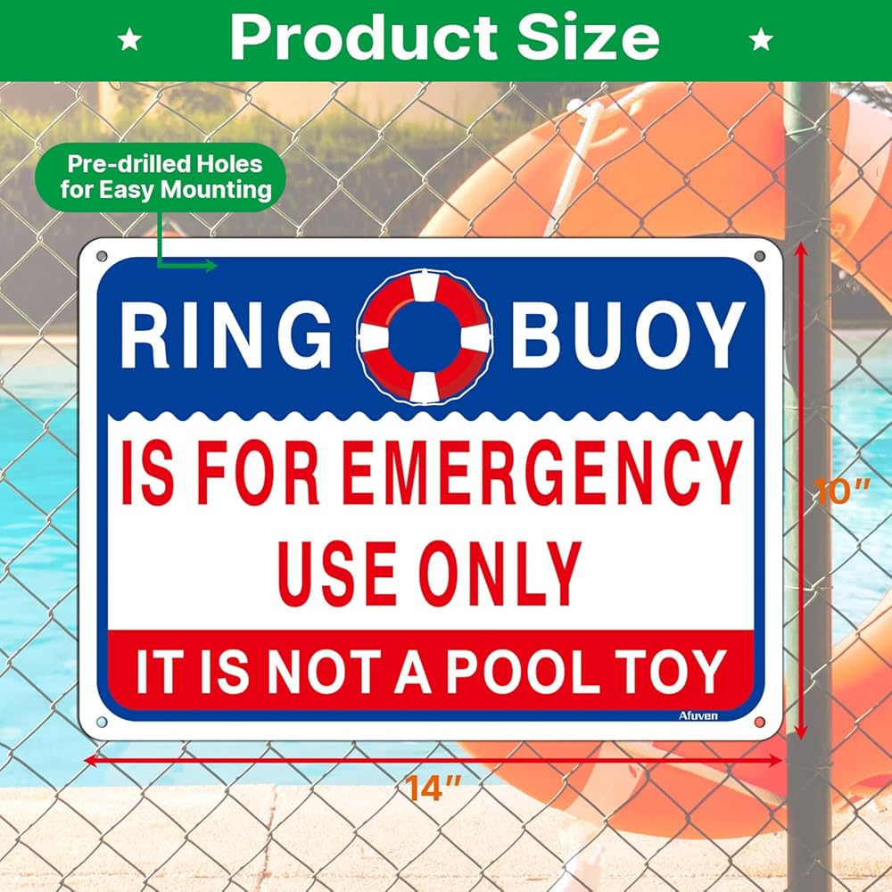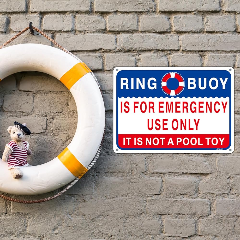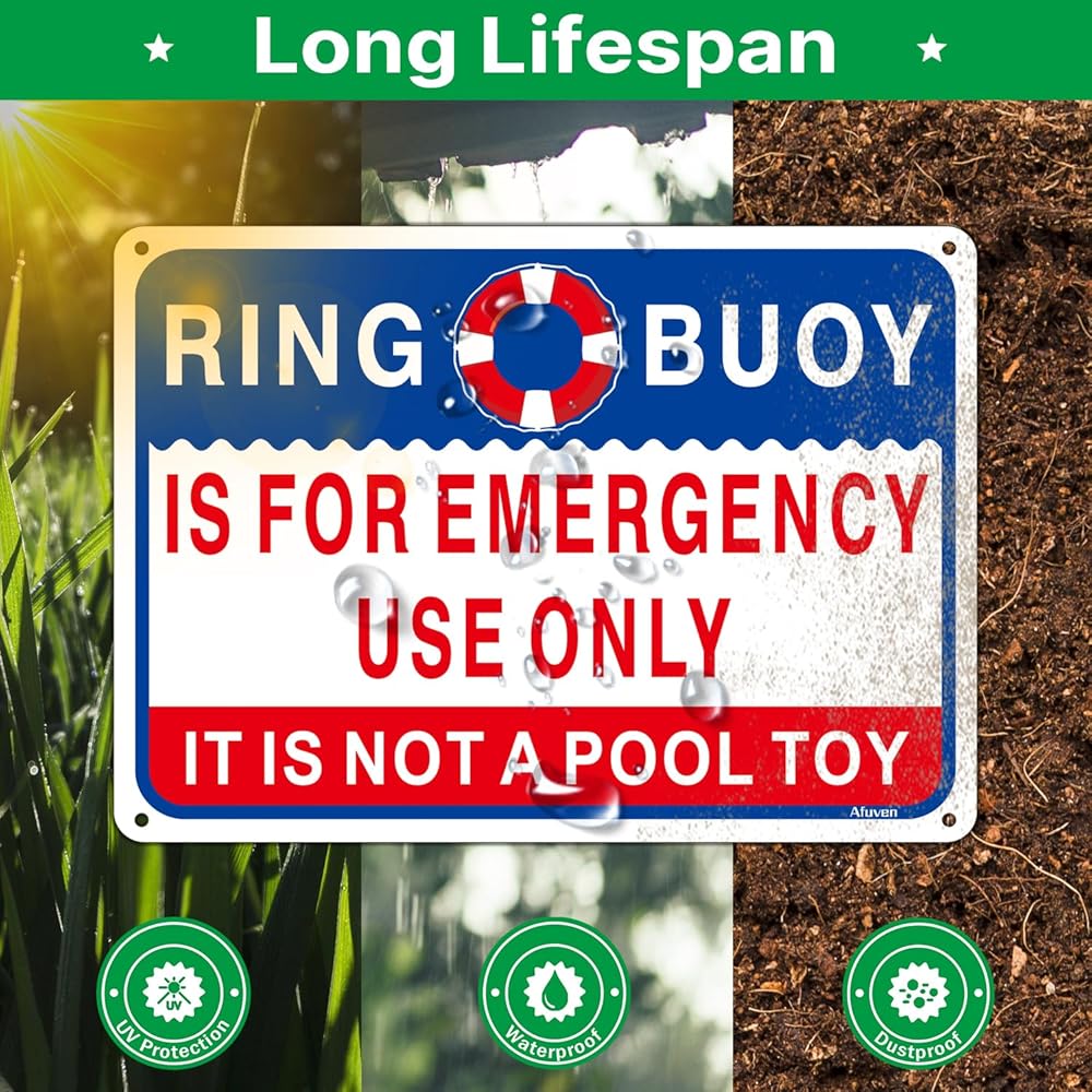 العوامة الدائرية للاستخدام في حالات الطوارئ فقط، إنها ليست علامة لعبة حمام السباحة مقاس 14 × 10 بوصة، علامة عوامة حلقية خالية من الصدأ من الألومنيوم لحمام السباحة، علامات أمان حمام السباحة مقاومة للطقس، سهلة التركيب، عبوتان