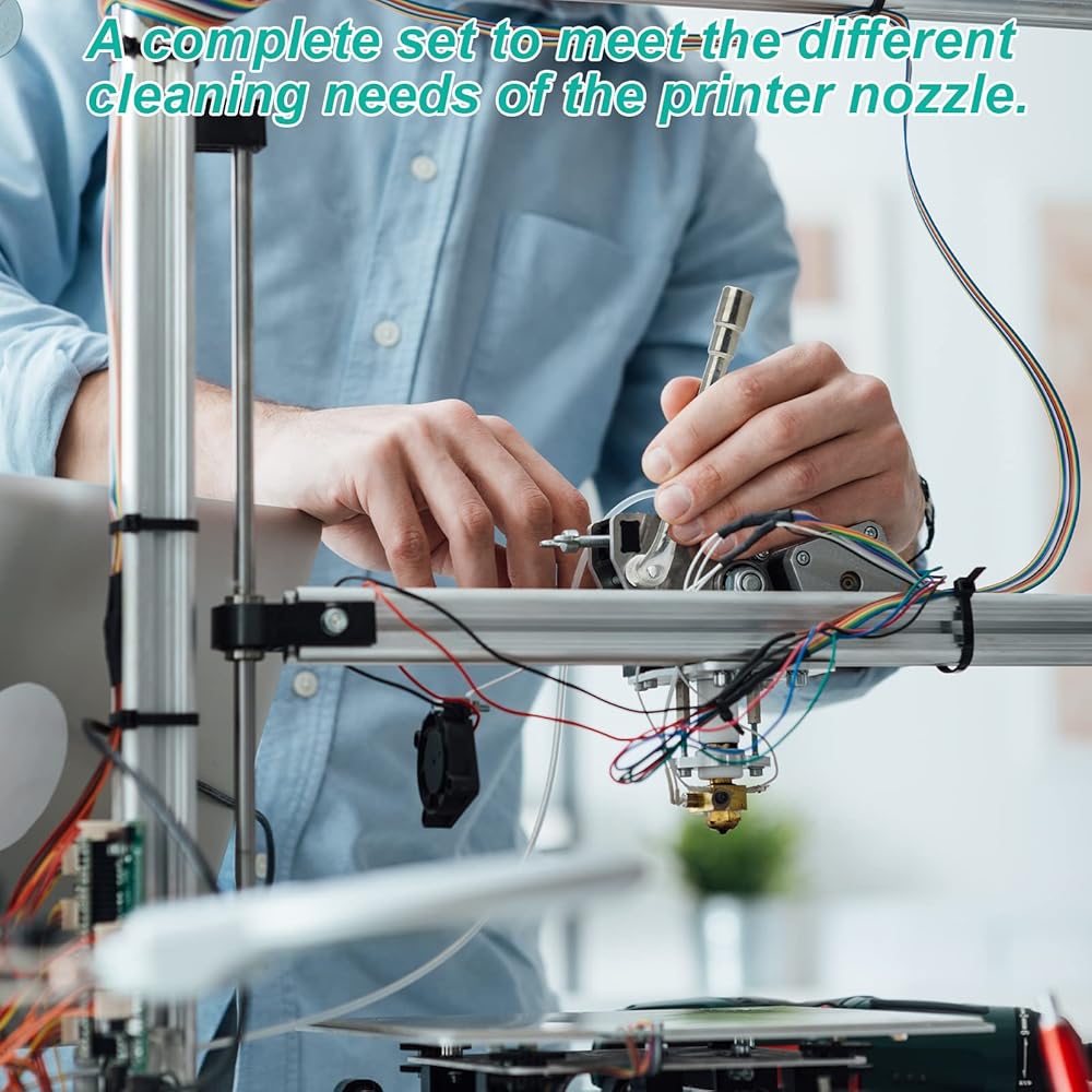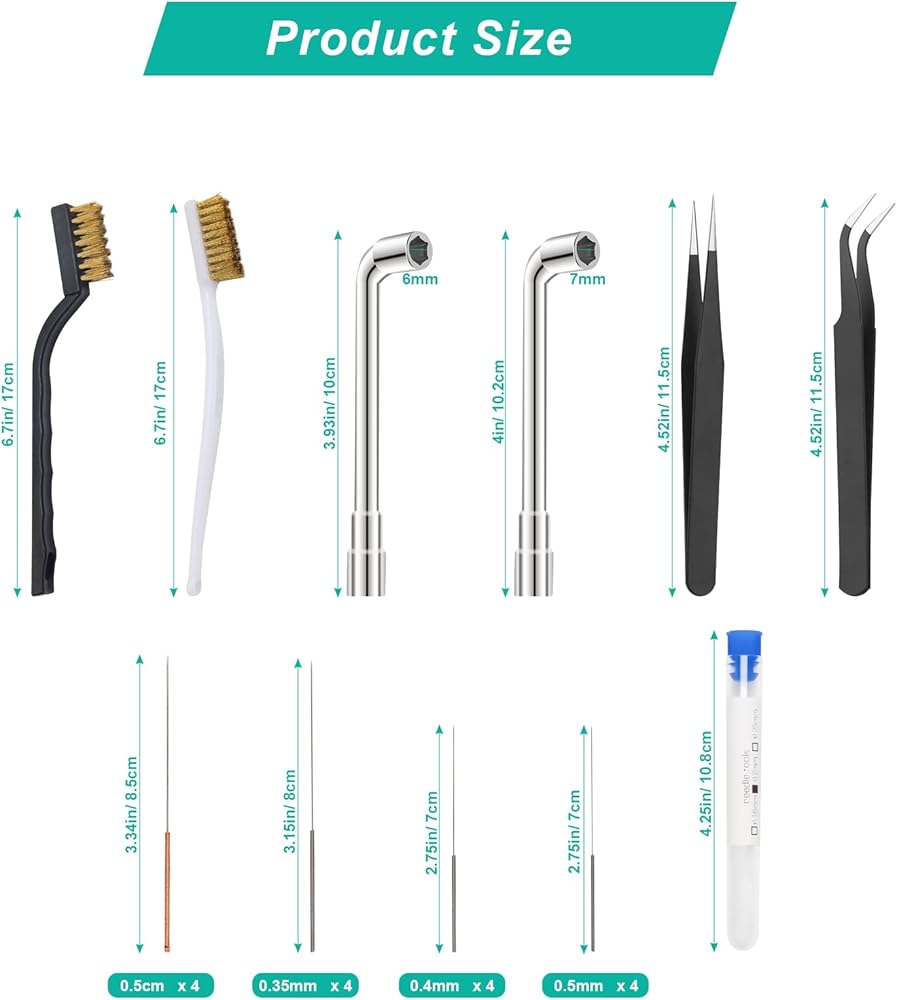 26PCS Tools for Cleaning : You will receive 26 3D printer nozzle wrench cleaning tools, 2 L-shaped wrenches, 2 copper wire brushes, 2 tweezers, 4 storage tubes, 16 cleaning needles (available in 4 sizes). Rich set that can be cleaned to more corners