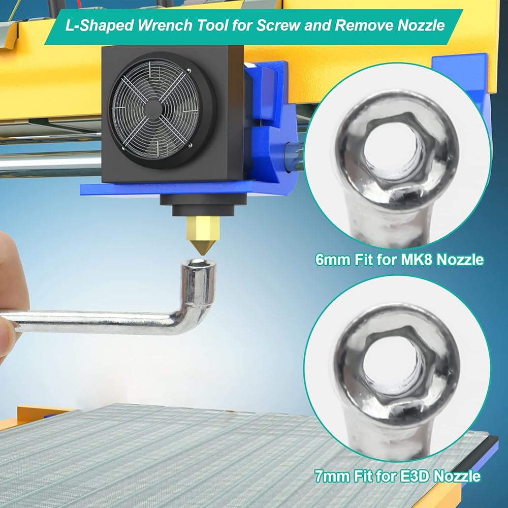 Fasten and Remove Nozzle : L-shaped wrench has 2 sizes, the diameter of the hexagonal mouth is 6mm for MK8 nozzle, 7mm for E3D nozzle, both ends are open, suitable for tightening or removing nozzles in different directions, practical and convenient
