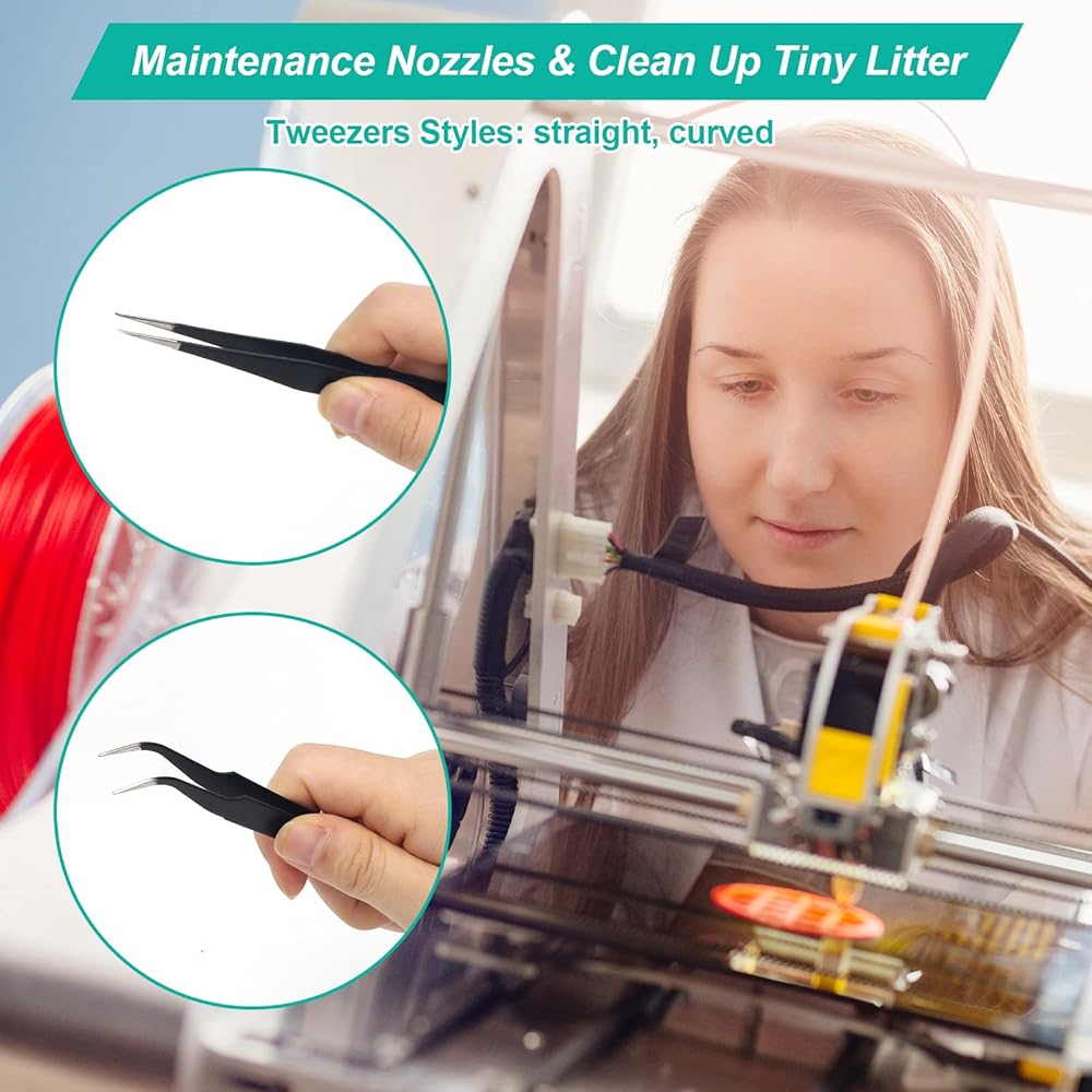 Cleaning Details : Tweezers are made of stainless steel, painted surface, and not easy to rust. Cleaning details for maintenance of printer nozzles. The tweezers has 2 styles, straight and curved, with protective cover to prevent fingers from being stabbed